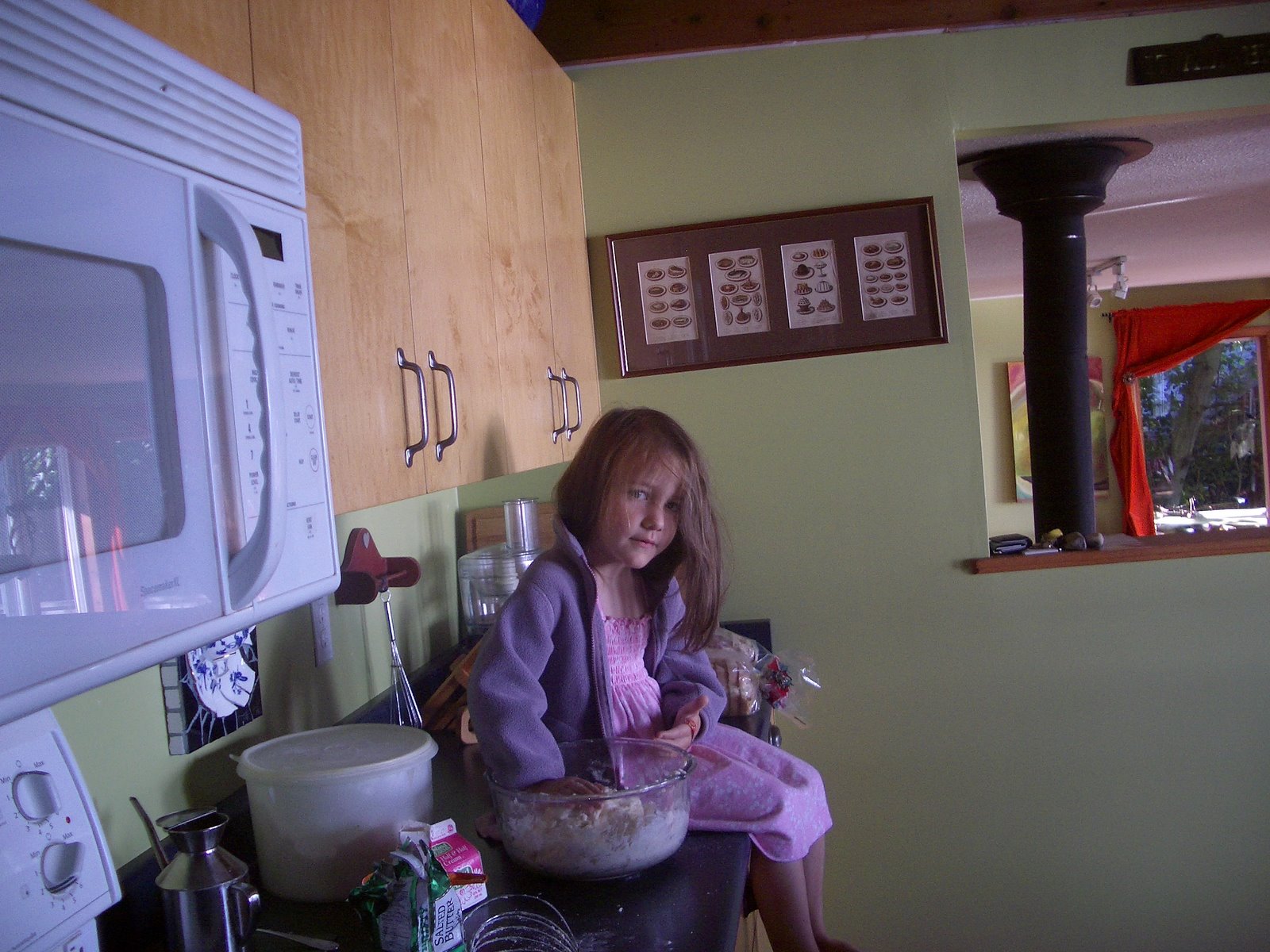 In this next photo, you can see that she takes these responsibilities very seriously–I think here she’s been charged with maintaining a gentle pressure ’til Paul gets back with the baking sheet — who knew that was an important step?
