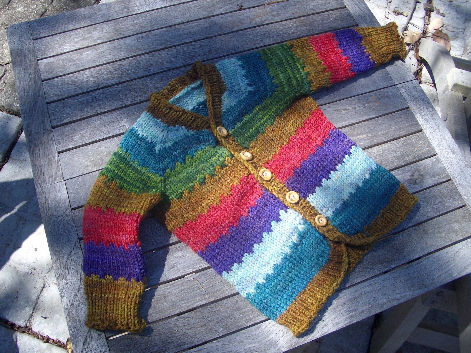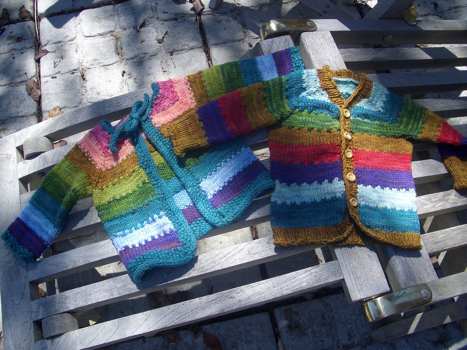 Before I go eat my pancakes, I’ll give you a quick glimpse of the Rocketry cardigan. This was such fun to knit, although I was a bit silly about the main trim colour, panicking about running out when I’d just mislaid the second ball. (In fact, I realized when I packed the leftovers in with those from the Tulip Cardigan, I had the same colour leftover from that sweater, so I had more than enough.) What was most fun about knitting this–especially for someone who hasn’t much experience with seamless sweaters knit in one piece from the top down (this was only the third I’ve done this way)–was the way you gather up stitches for the ribbed edging all around the sweater. The bottoms, sides, neck, collar — these stitches all get gathered onto a circular needle with the sweater itself scrunched below, and as row after row of ribbing gets completed, it’s almost like having a strange-looking shower cap below the needles. I also loved how easy it was to put the buttonholes in — just one row of counting out exactly as the pattern instructed, so there was no measuring at all, but the buttonholes are perfectly spaced. And once again, the Dream in Colour Superwash Worsted Merino is worth raving about, not just for the rich, fun, semi-solid colours, but also for the soft squooshiness which makes it perfectly suited to a baby’s skin.