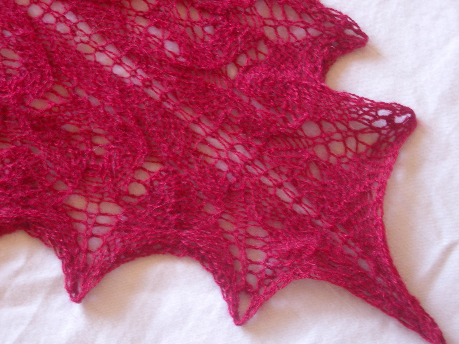 Here’s a closer view so you can see the “feathers” — sorry this is less focussed than it could be.a close-up shot of the shawl’s “tail” point