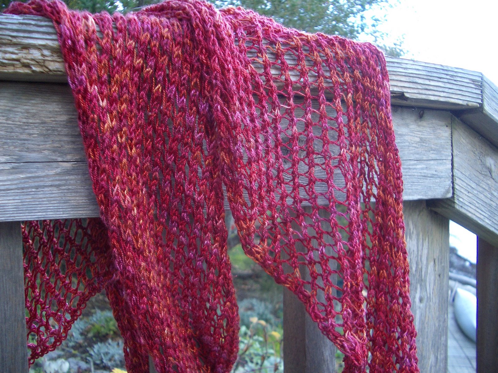5. And I’ve got a picture of my new FO for you. This is the Montego Bay scarf from Interweave Summer 2007, which I made sans fringe — not sure if I’ll regret that omission or not. I suspect this will be a gift anyway, as there’s probably too much orange in the colourway to be flattering on me. It’s such a glorious colourway (Seasilk’s Sangria) I just couldn’t resist it in my LYS (Mad About Ewe in Nanaimo).