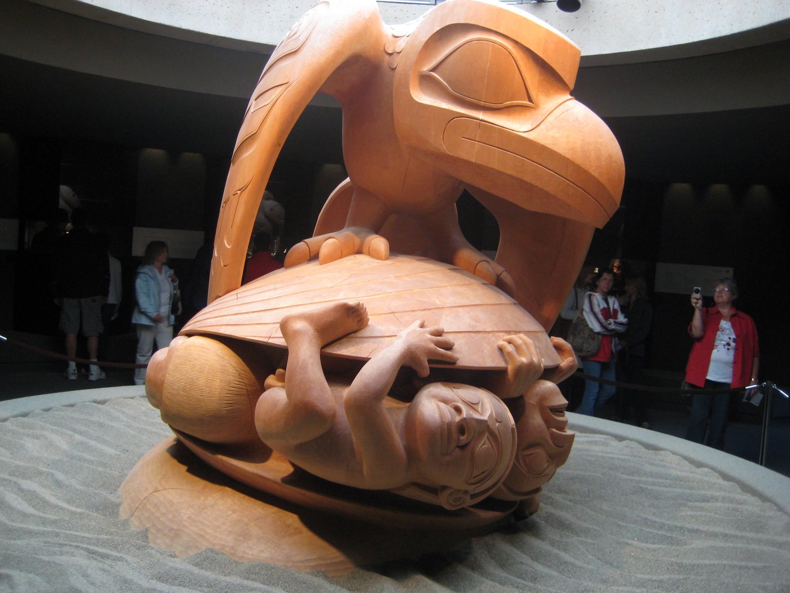 This photo, and the next, are of Bill Reid’s statue, Raven and the First Men, from various perspectives. The statue depicts Raven bringing forth the first men, naked, weak, frightened, and rather foolish-looking, from a clamshell — Reid and Robert Bringhurst’s book Raven Steals the Light offers a written version of this foundation story, one of many that showcase the lascivious, mischievous, comic Raven.
