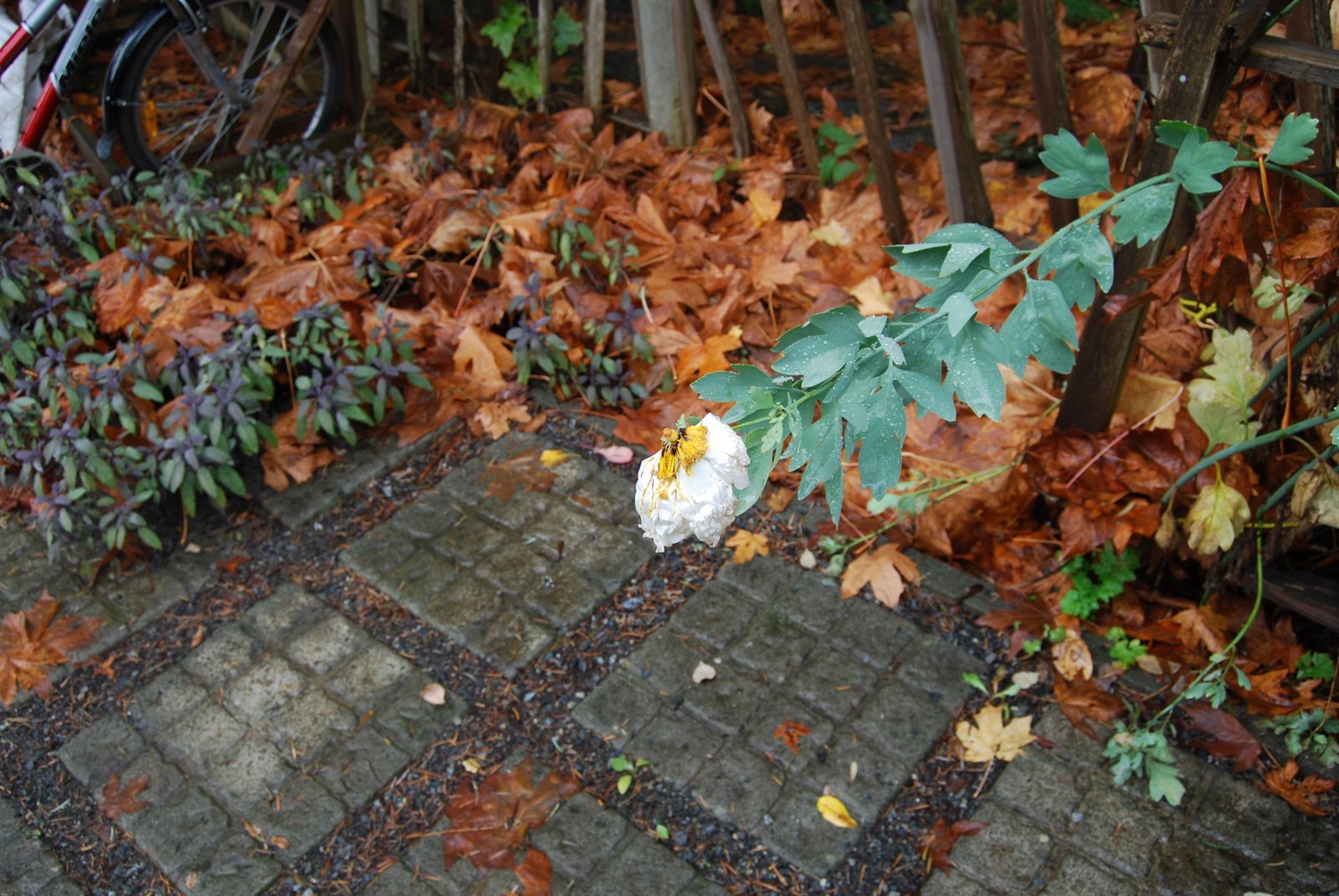 While wandering in the garden, I couldn’t help but marvel at the November blooms, bedraggled though they are, of the Romneya Coulterii (below)– after all, we’ve had several bouts of frost already, and this is not a frost-hardy plant. The friend who gave it to me, an amazing gardener, lives in Regina, Saskatchewan now — maybe I should tell her to give it a try there 😉 Of course, the bloom is much less impressive without the sunlightit might reflect in July and August, but still, any blooms in November deserve grateful admiration, no?