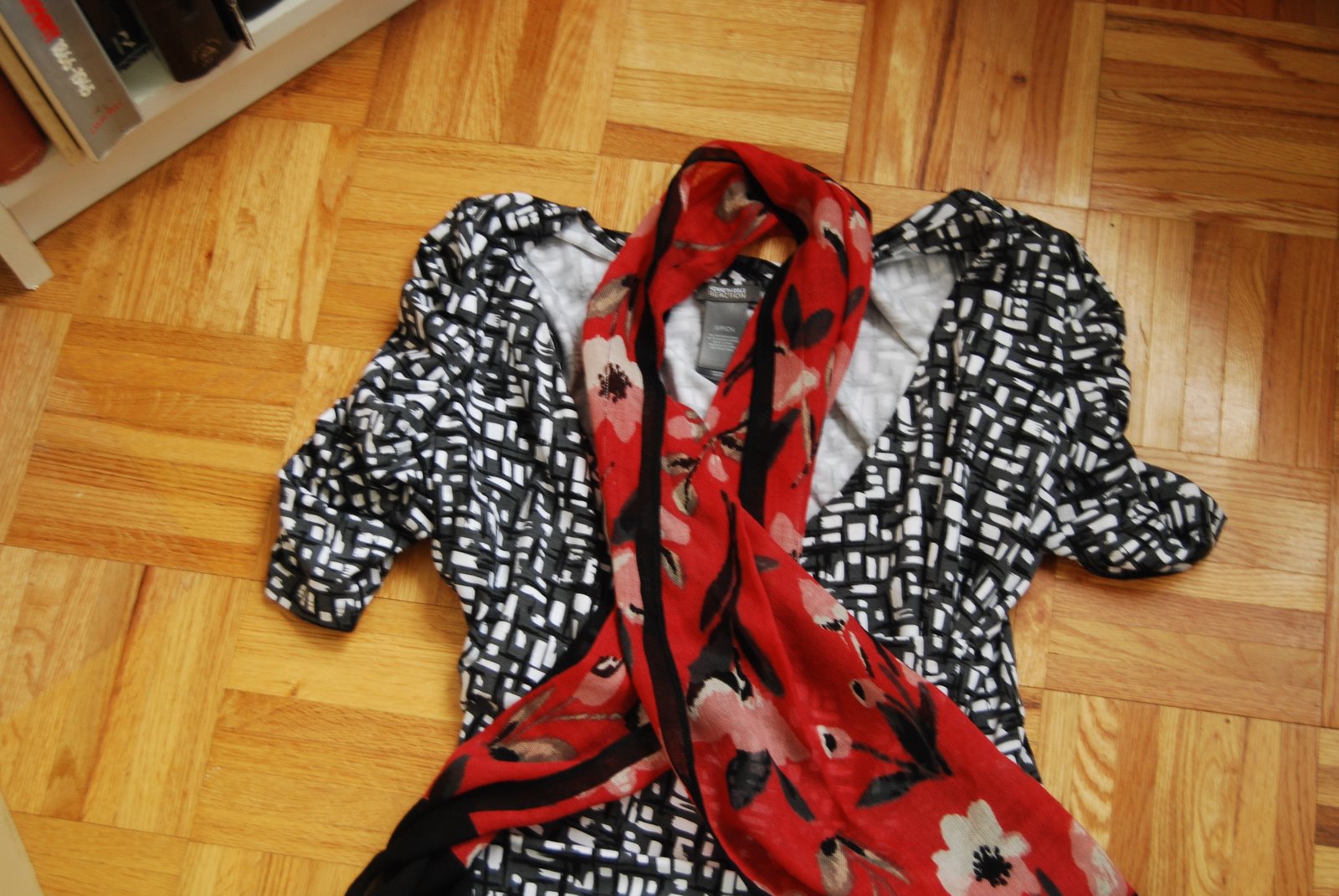 I think the scarf works better with the dress, because the black and white are more evenly dispersed and so it looks more neutral – does that make sense? The pattern on the cardigan looks more uneven in terms of colour mix and the flowers look the same size as the flowers on the scarf. Or perhaps it’s just the picture quality. That’s my take anyway.