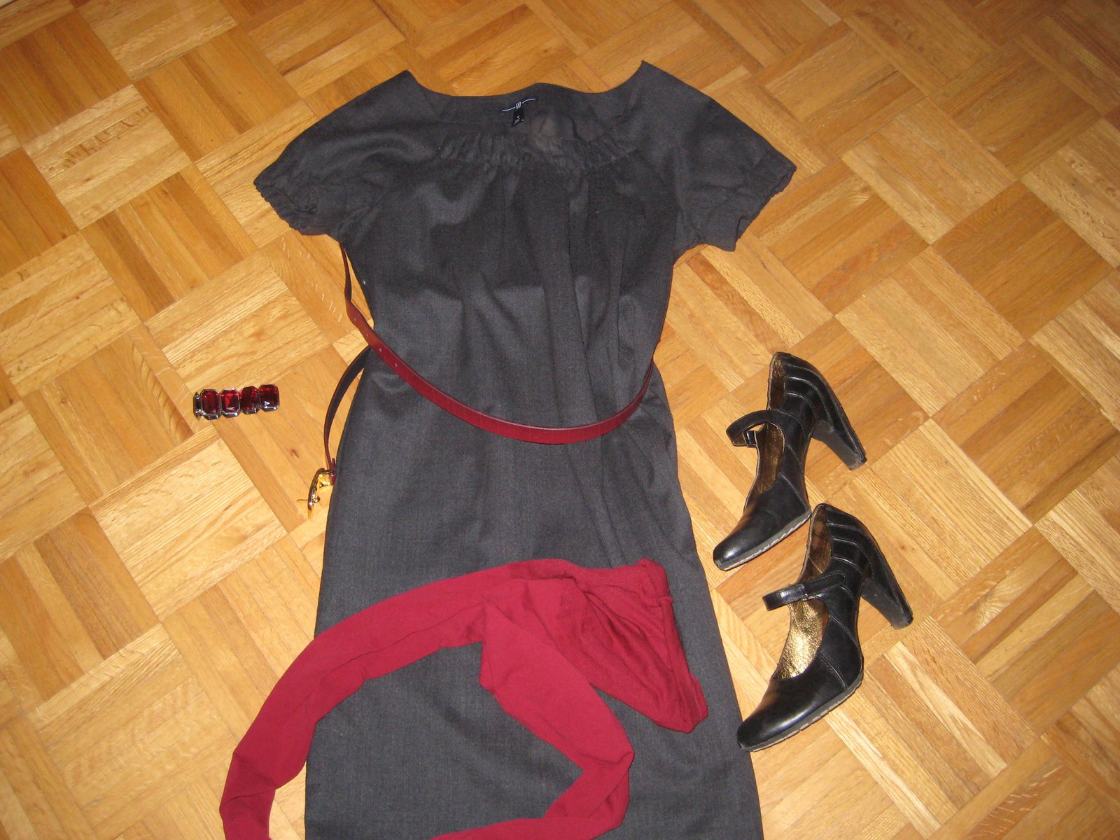 Tomorrow I expect to be back at work, and meanwhile, I’ve got energy enough to post these photos I took last week in response to Duchesse’ post on neutral “background” dresses. This grey wool flannel one is a favourite of mine — got it at The Gap last fall for something like $70, and I find it satisfyingly versatile — if only it had pockets, I’d consider it perfect. Last week, I wore it with red tights (I just needed to break out a bit!), a red belt and a red-fake-stone-blingy bracelet.