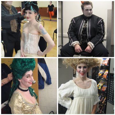 As well, it was festooned with all sorts of hanging devices which accommodated acrobatic marvels — gym rings, ladders, trapezes — which marvels were matched on the ground by a stunningly-garbed acrobat on stilts: the flowing, tangerine costume enveloped the actor’s legs for an astonishing visual impact — 10-12 feet of brilliant colour moving flamboyantly through the whites and blacks of the courtiers’ costumes. As well, another stuntman wove a trick bike through the moving, thronging, sexily-clad court. And when I say sexily-clad, I should probably mention that there was some sexily-UNclad as well — in an upper tier within the structure were beautiful young female dancers, at least one of whom was topless. To give you an idea of how sexy these costumes could be, here’s a set of photos depicting backstage preparations, also from the VOA blog.What was also surprising about the set was how well the scaffolding around it and the supporting metal stilts below it suggested the setting for the opera’s more nefarious actions — the dark alleyways of a city where hit men might offer their services or courtiers kidnap young women for the duke’s pleasure were credibly found in its nooks and crannies.