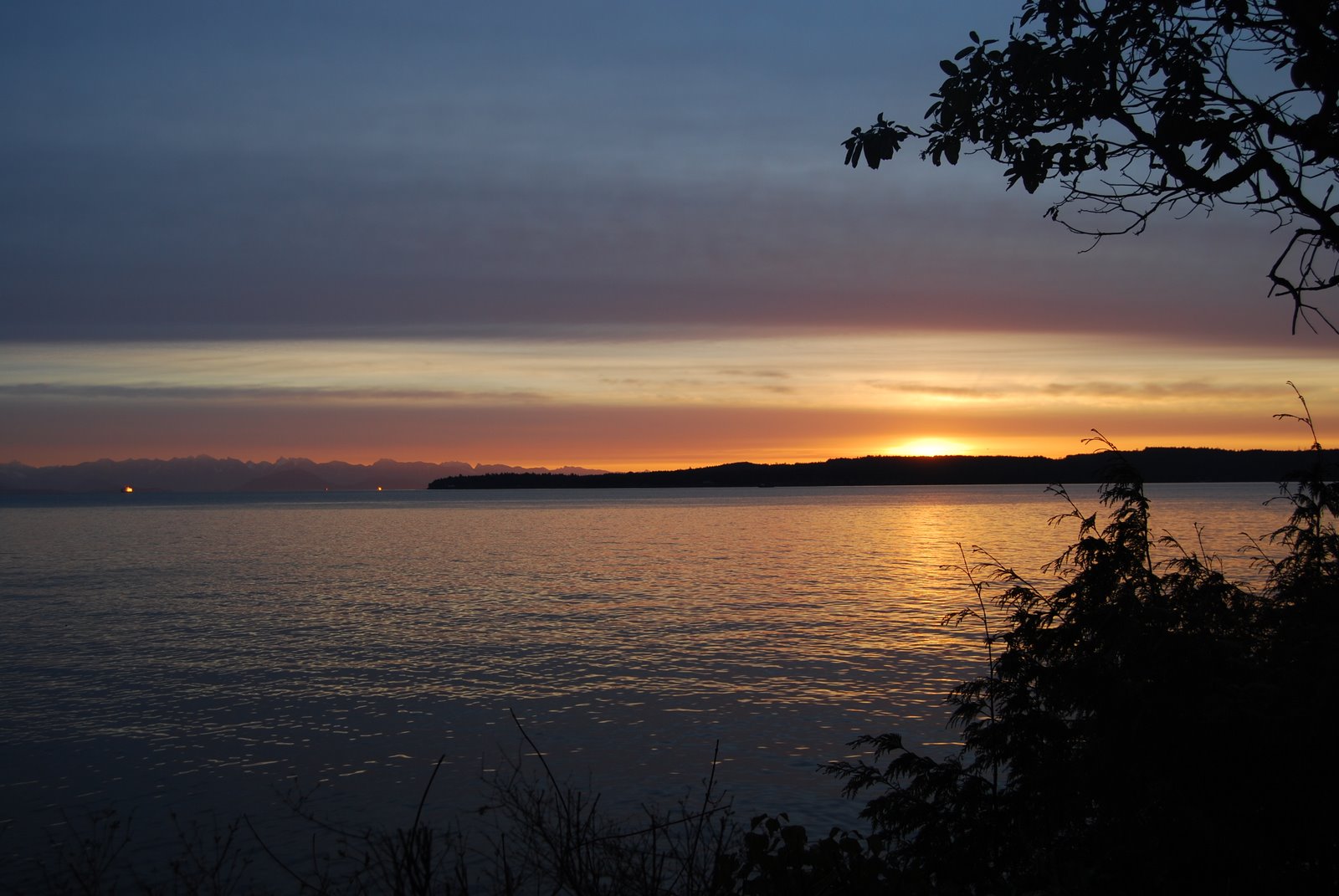 The lights you can see on the left near the horizon are not lights, but rather boats lit up by, reflecting, the sun — they were dazzling!
