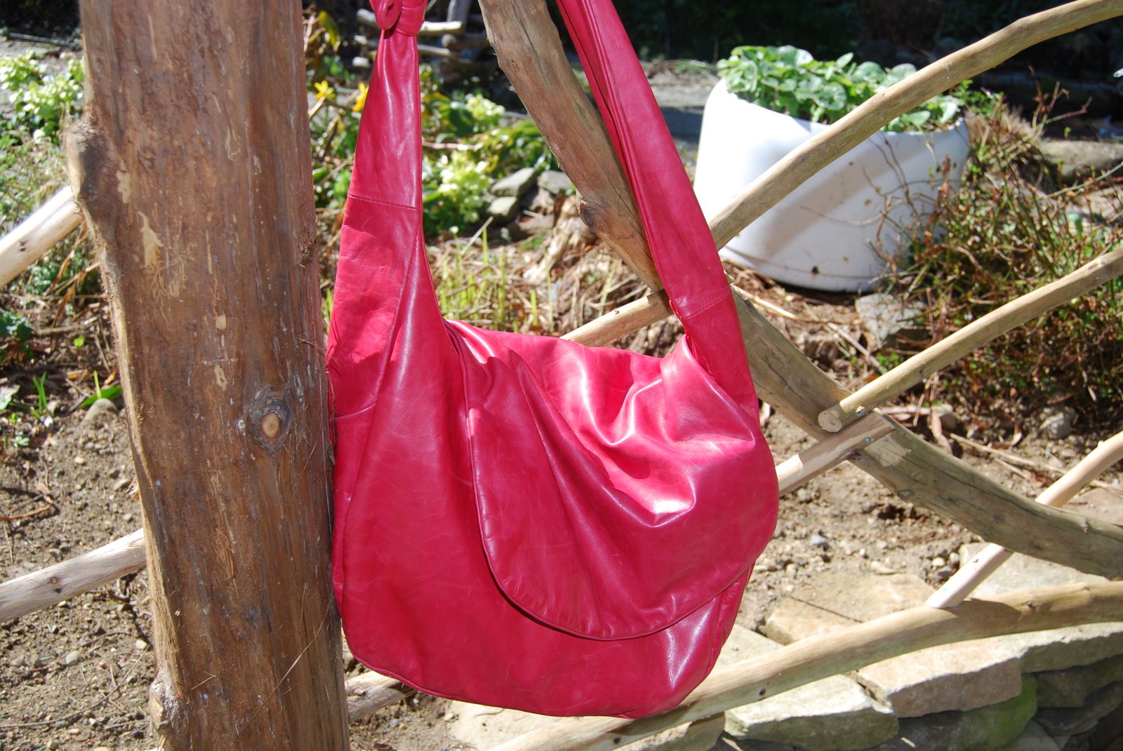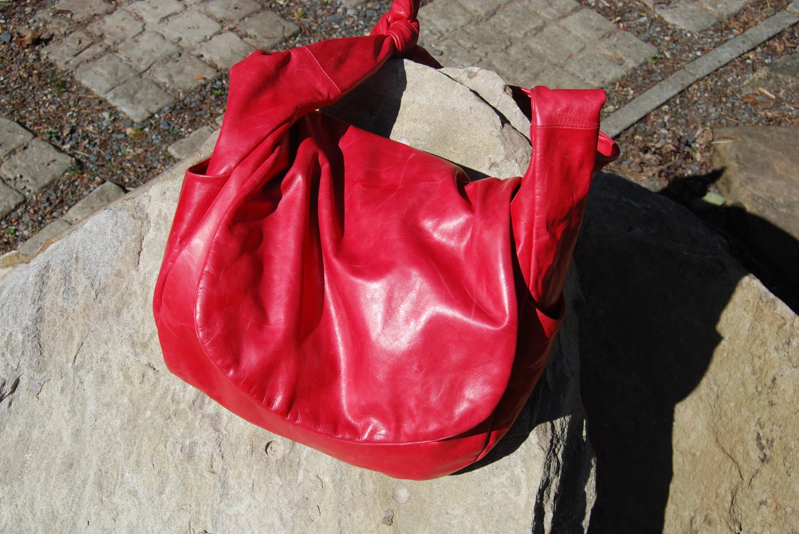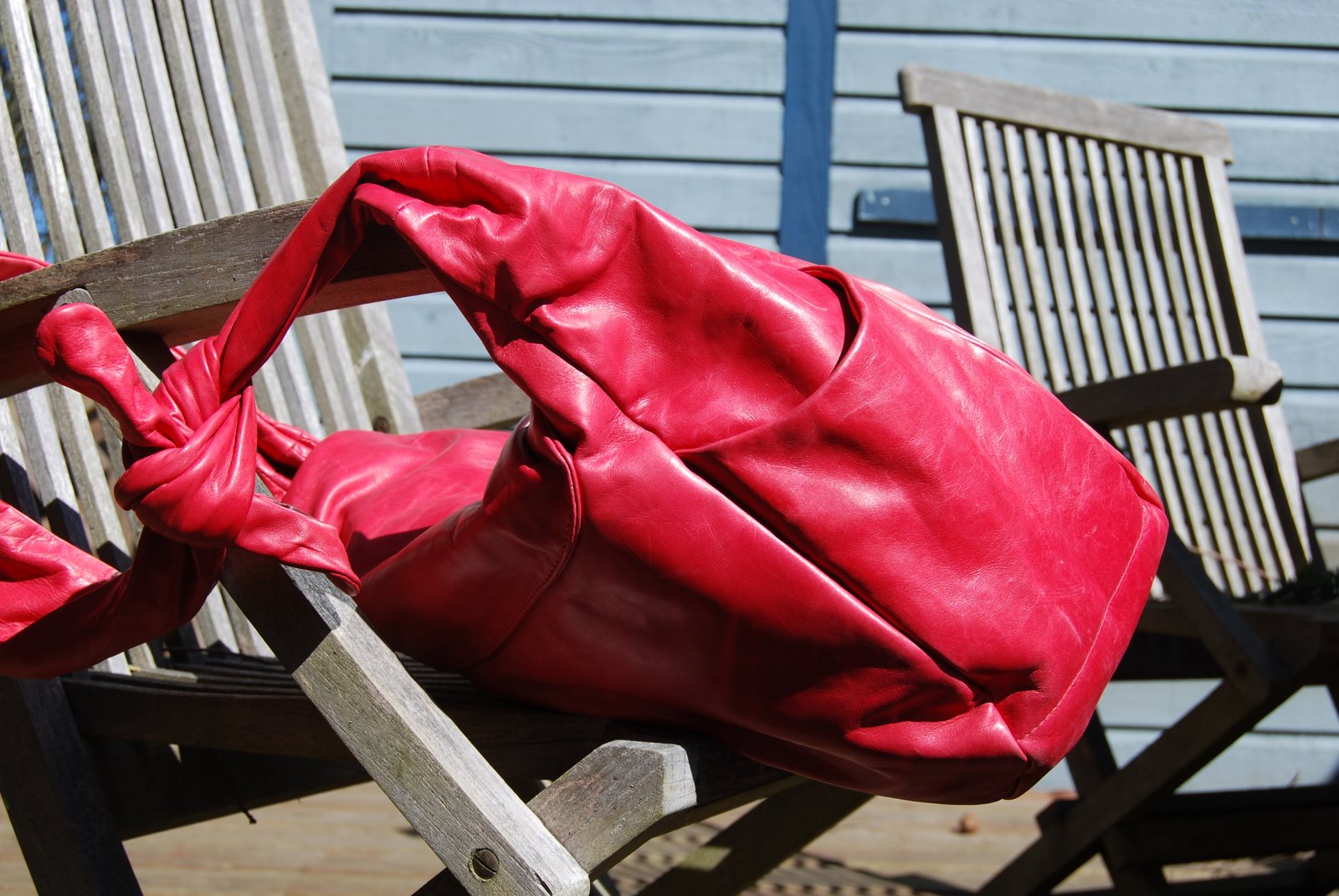 My big challenge was choosing the colour — I rejected the possibility of the mushrooms, taupes, or greys and see-sawed between a versatile mid-blue and this tomato, but finally decided to go for the splash and I’m glad I did. To help me choose between all the possibilities, Kimberley hauled out her own convincingly worn-in bags so I could see what they looked and felt like after years of use. That’s not all — she emptied her own purse and insisted I fill it with items from mine and walk around with that weight — she really wanted to make sure I would be a satisfied customer.