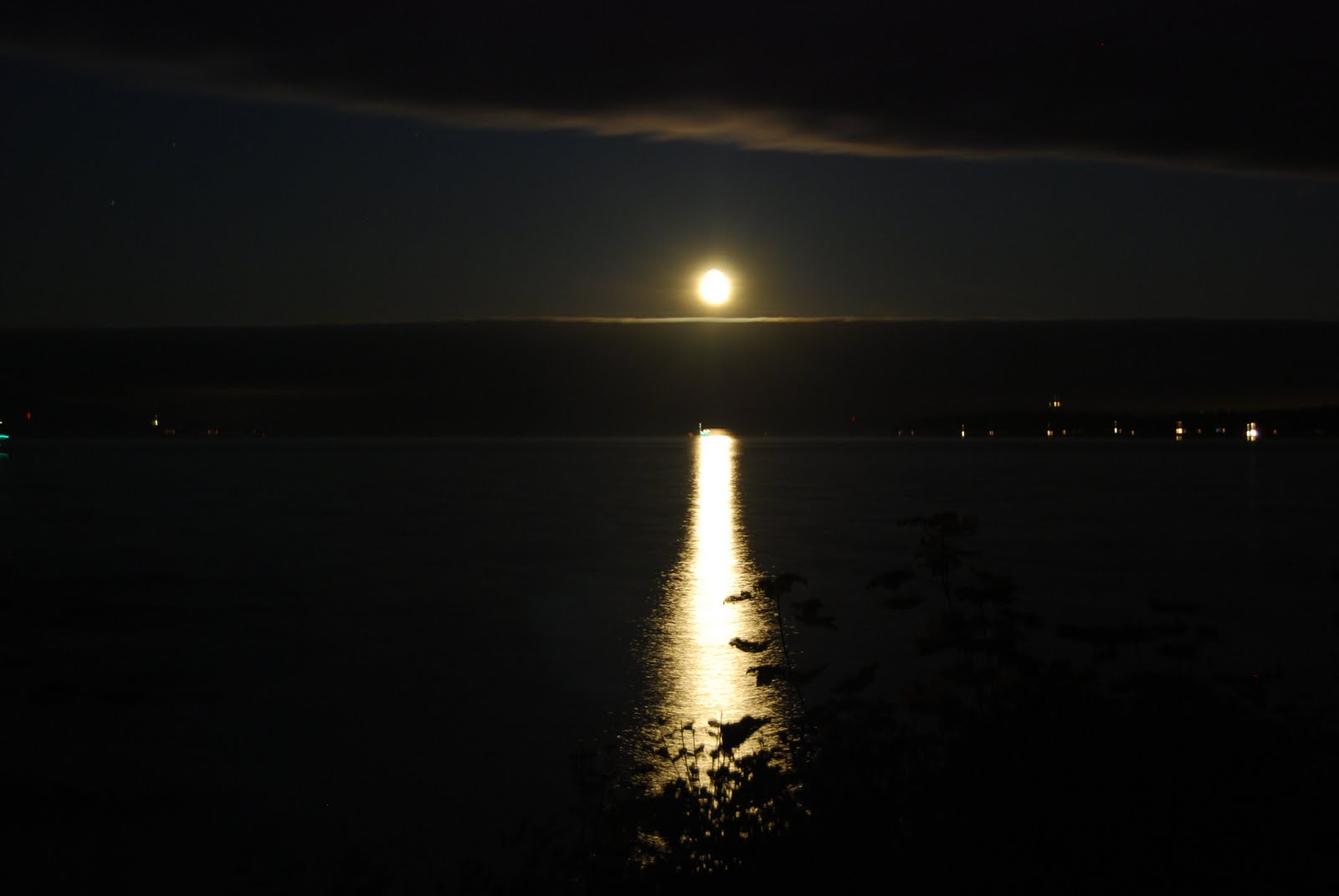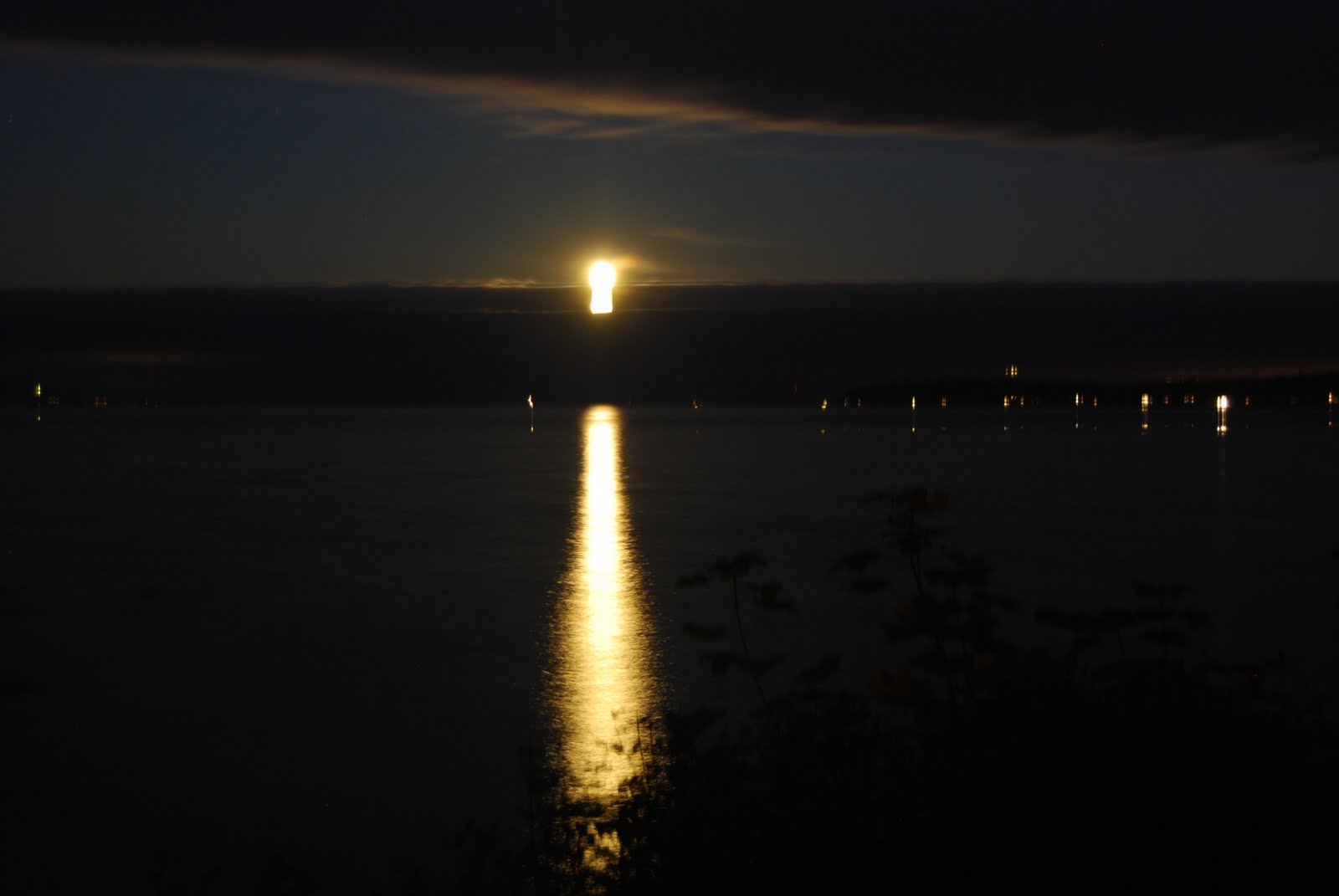 As the moon rose to the East tonight, igniting a pathway across the water to the mainland, I wished once again that I knew how to photograph it. Suddenly, I got an idea, and switched off all the house lights, taking my camera outside and setting it on the rail of the deck. On a solid surface, I could count on it staying steady, and I turned off the flash, looked through the lens ’til I had the shot I wanted, and then clicked the shutter button. I counted off at least twenty seconds before the shutter clicked shut again. A primitive way to capture enough moonlight to, well, capture the moonlight, but I am pleased with the results.
