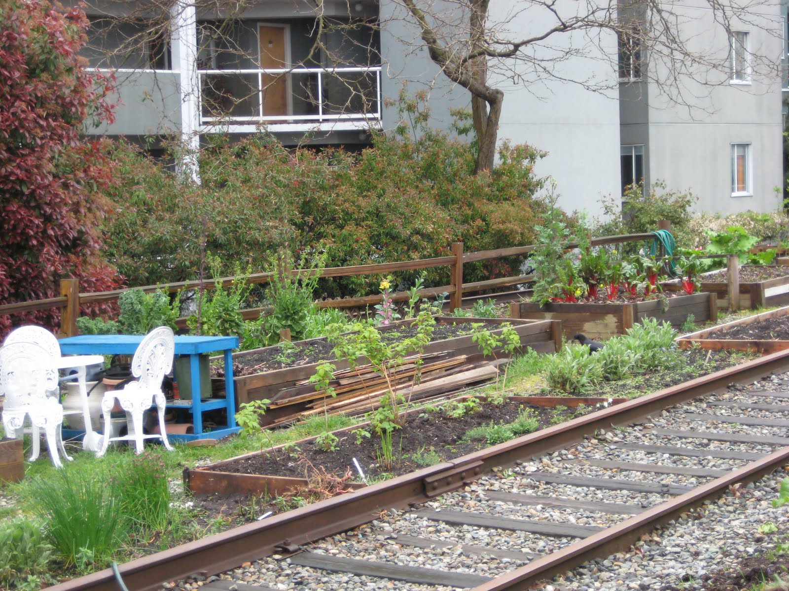 After our Classico breakfast (crispy pancetta, perfectly fried potatoes, sunny-side eggs, and delicious toasted ciabatta), we headed over to Granville Island. Along our way, we passed this guerrilla garden along the tracks. I’ve posted a photo of this rascally critter before, but I thought the delightful addition of the patio furniture made it worth posting again.