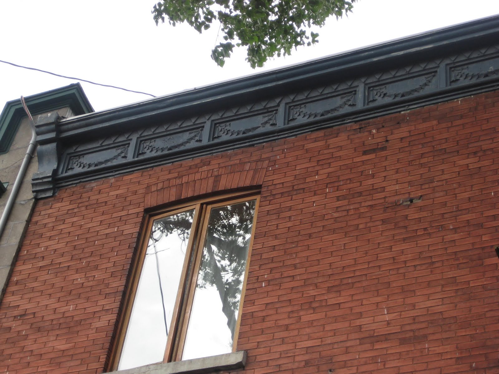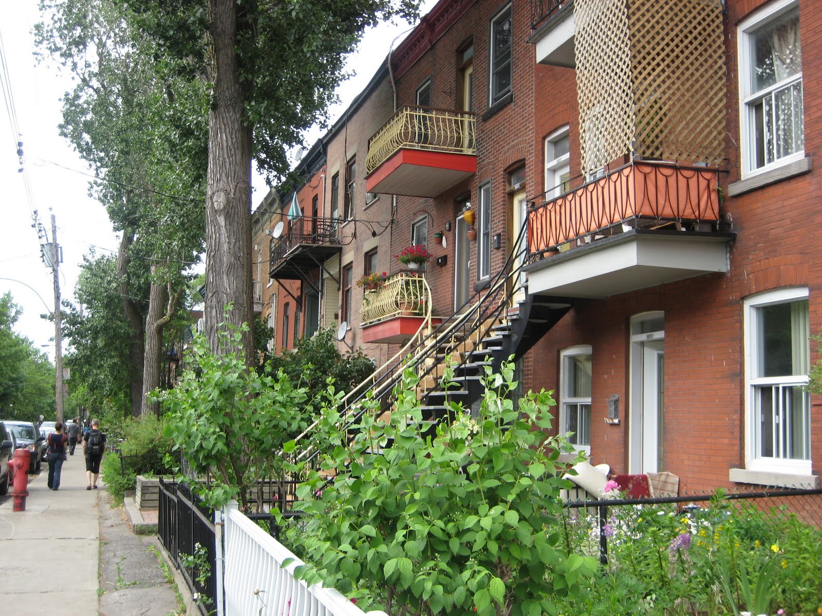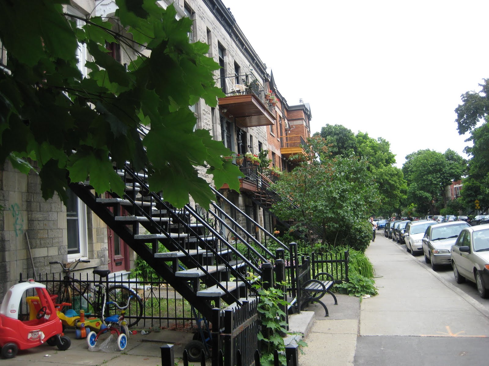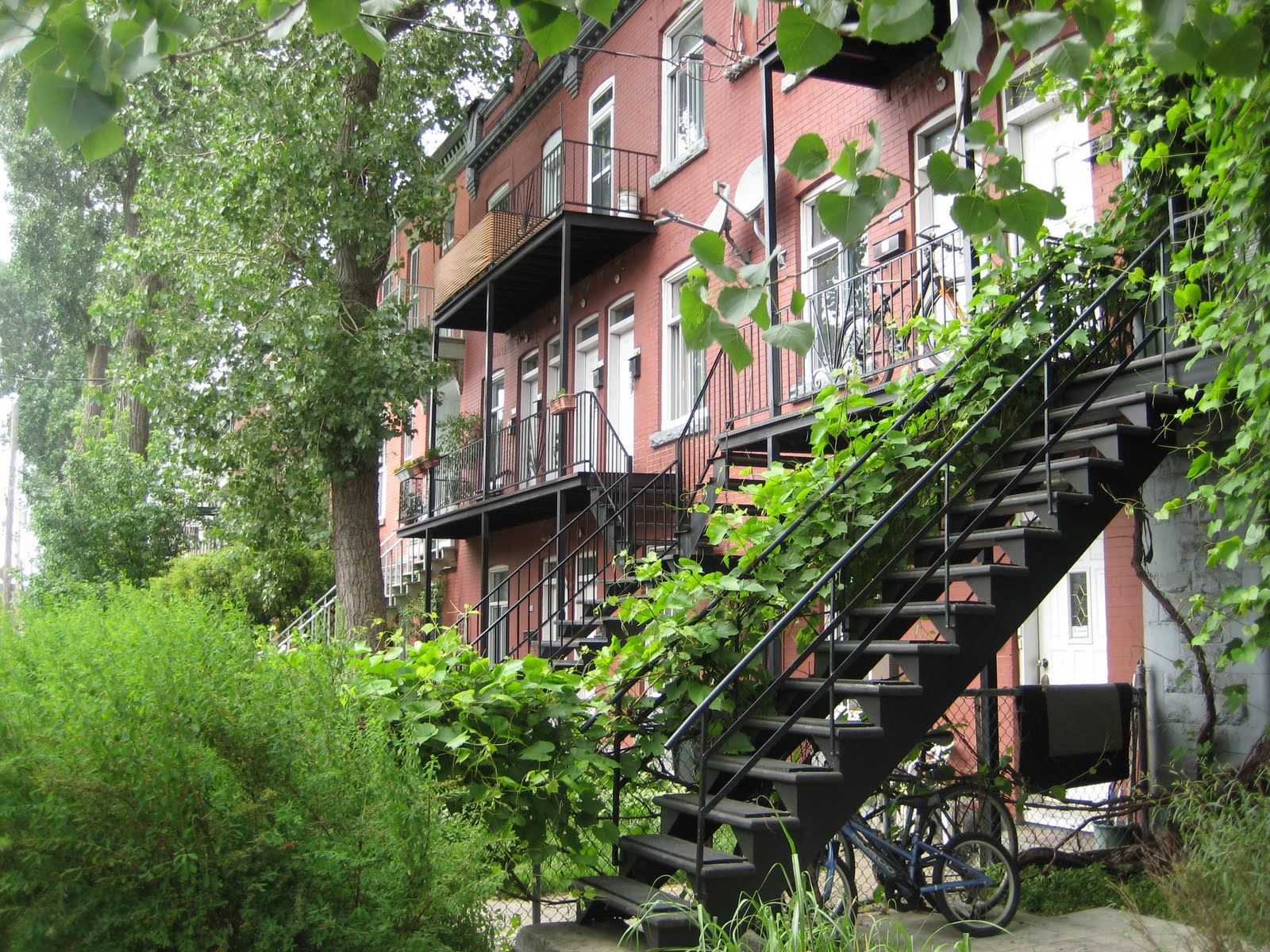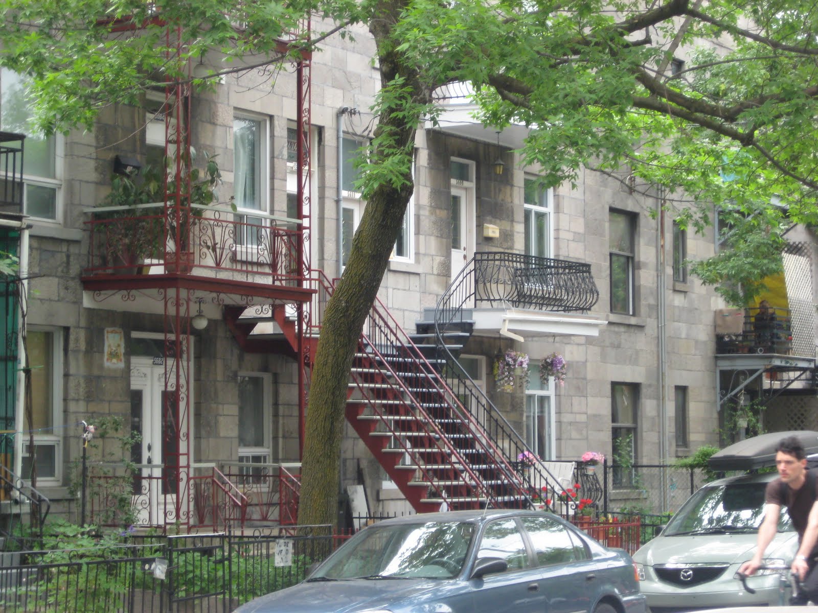Besides the exuberant use of colour, as I showed you in yesterday’s posts, older Montreal neighbourhoods are marked by a wealth of architectural detail — especially, but not only, balconies and exterior stairs. Not even the ubiquitous white plastic deck chairs on the balconies can detract from the charm. And everywhere green leafy goodness!