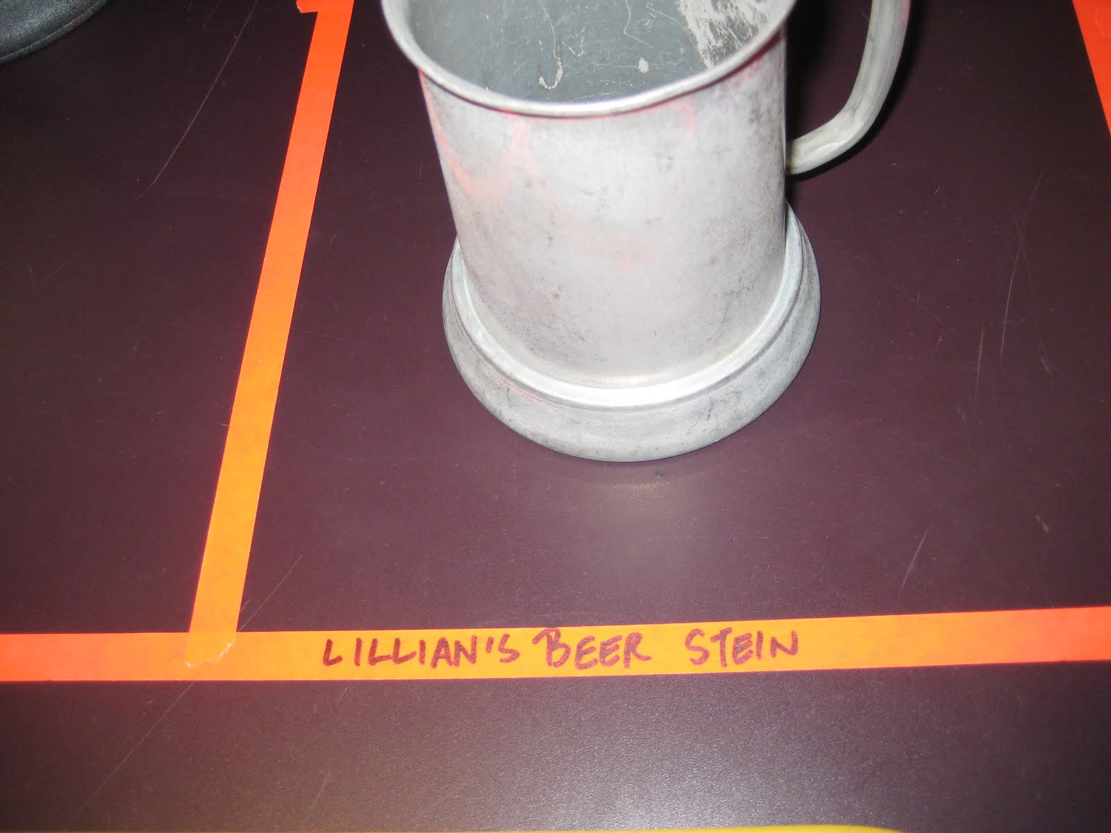 More evidence of the careful planning needed to ensure that there are no uncomfortable surprises onstage: a table laid out with the smaller props singers need to grab on their way to the front, divided by coloured tape into sections and labelled with the name of the prop that belongs in that rectangle. Here’s the beer stein Lillian needs for the scene in which she tracks her putative fiancé to a farm in North Dakota.