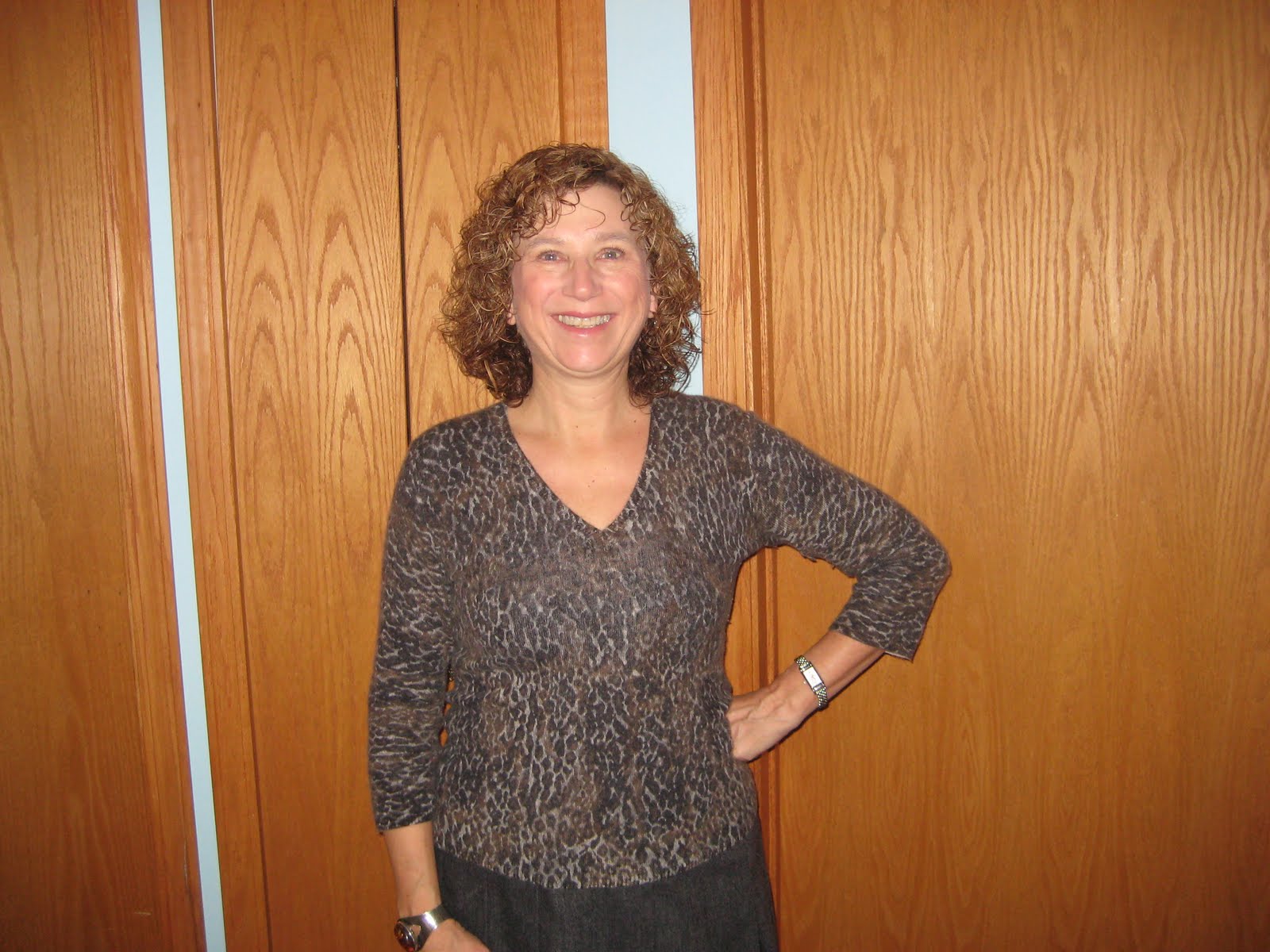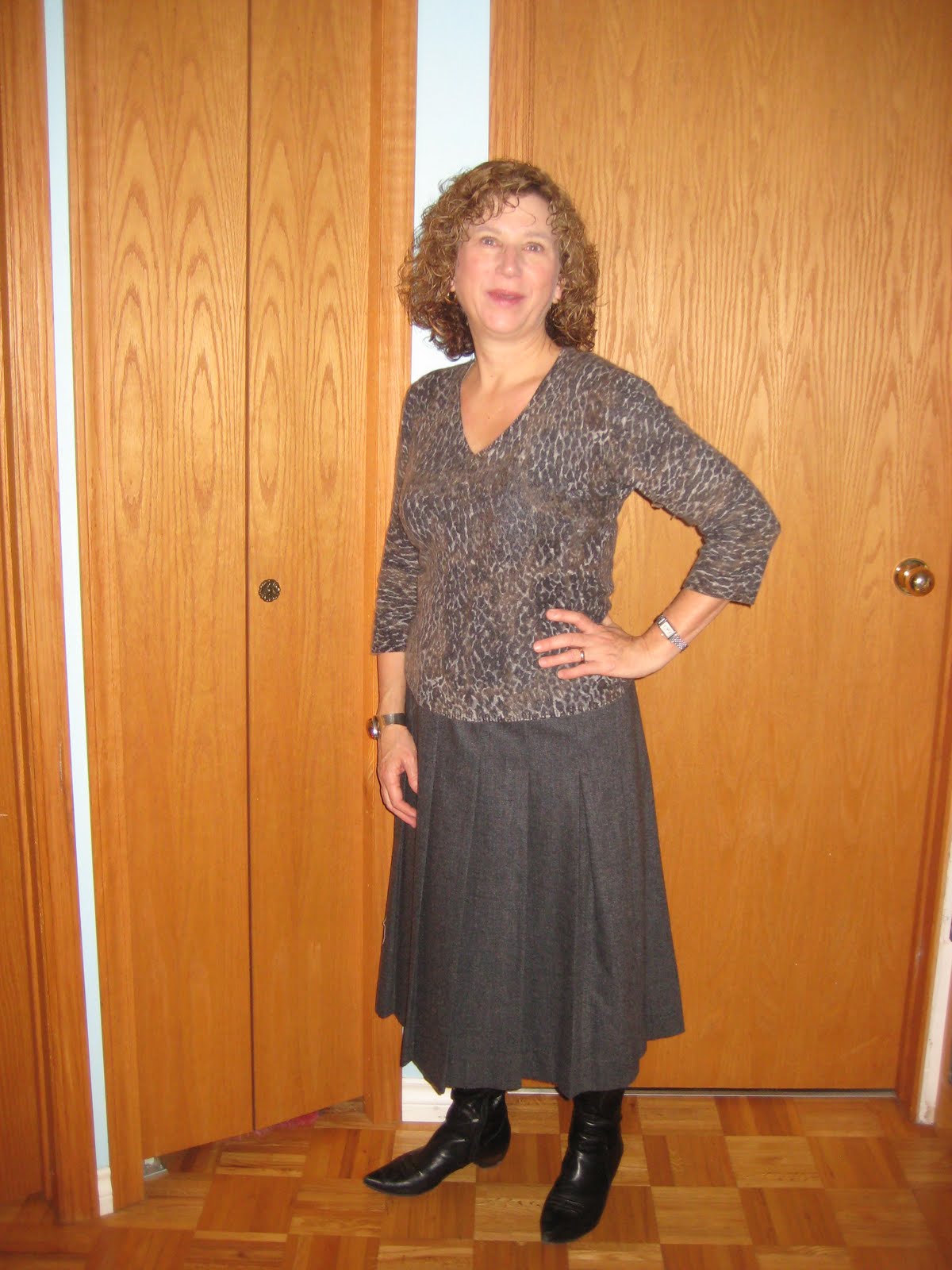 I was just a bit pissed off with Pater Friday morning, and he was amused enough about it to piss me off just a bit more and good-natured enough about it to snap the weekly What I Wore shots. The expression in the photo above shows it; the one below shows that I can muster a phoney smile.