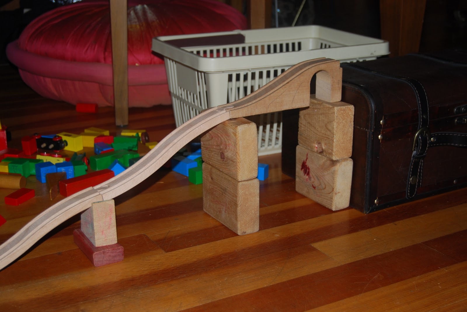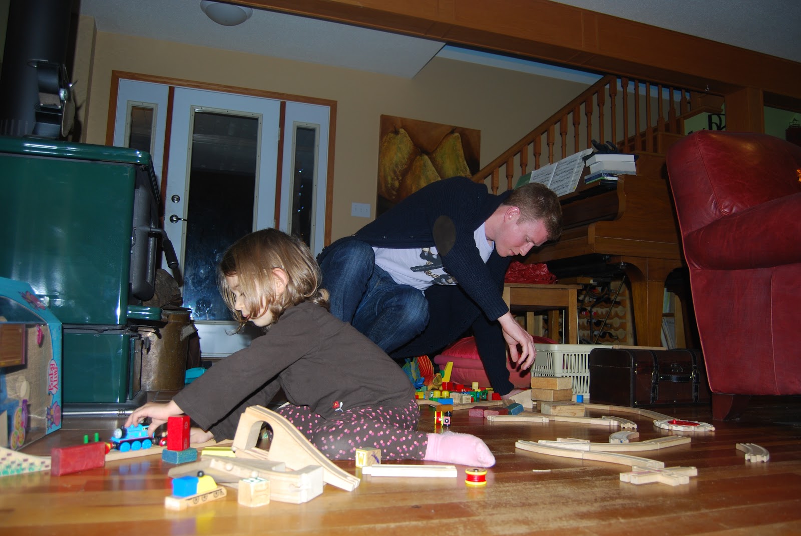 Unlike the Lionel trains of my youth (and now we’re talking 50 years ago . . . ), these wooden trains don’t require little ones to stand back, admiring, but rather encourage equal participation. Little Girl is clearly thrilled to have such keen playmates.