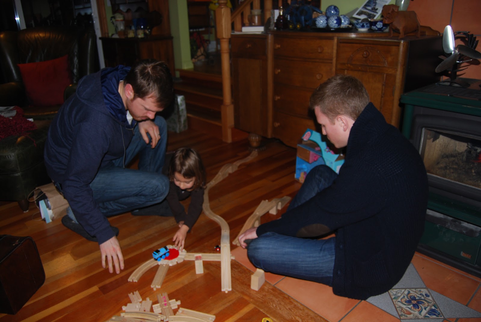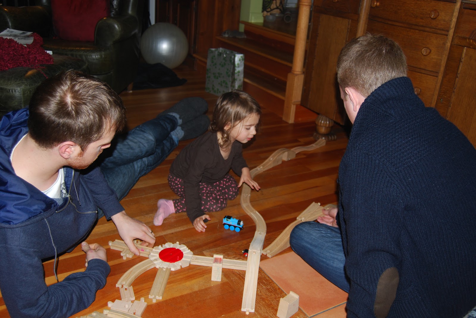 We added some fun pieces to our 30-year old Brio set (the newer pieces are actually Brio-compatible, as the toystore we popped into doesn’t carry the original) not only to entice Nola but also to ensure she got some help from the grown-ups. Sure enough, the uncles got drawn in. . .
