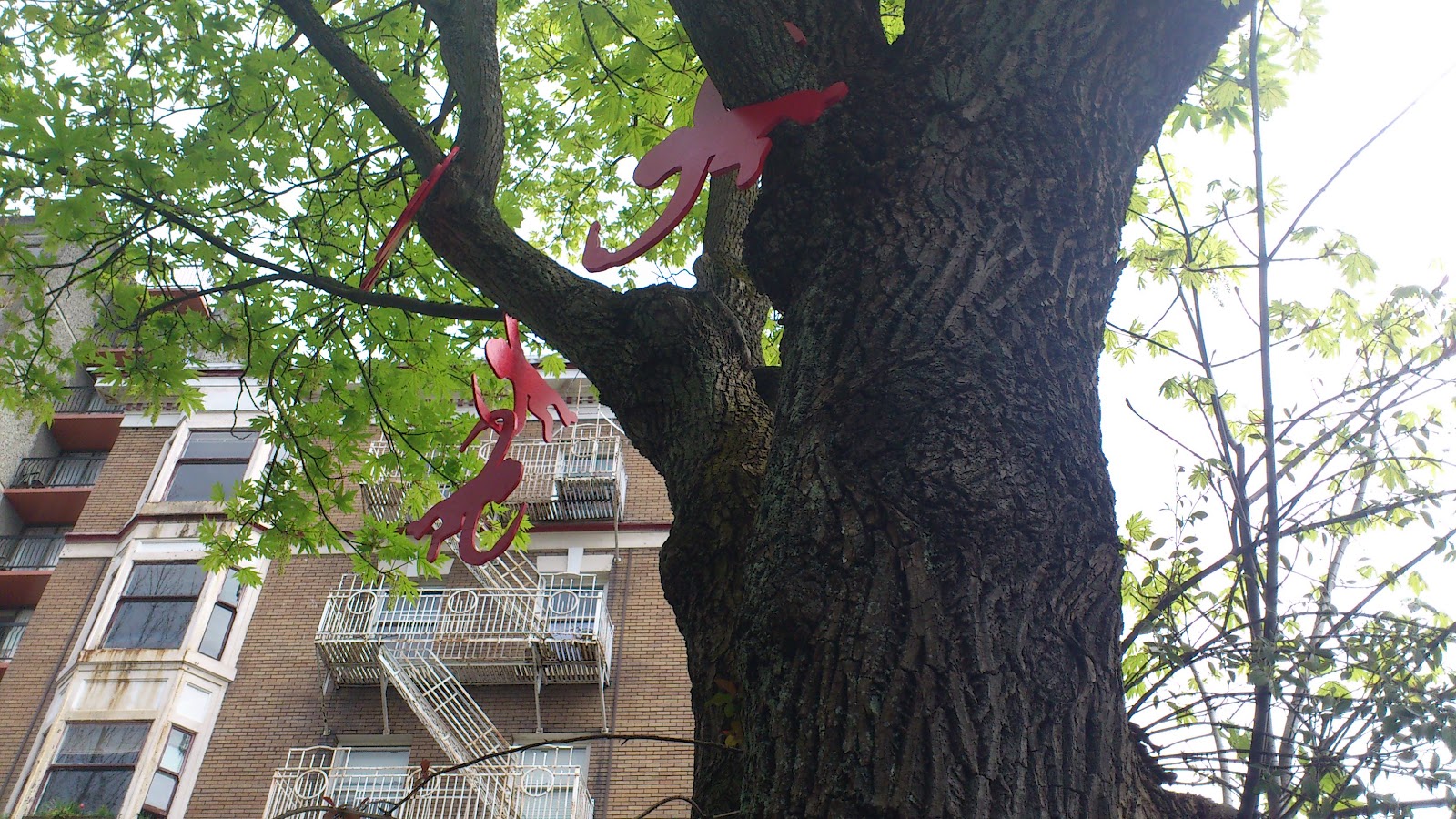 They definitely invited me to cross the street and photogrraph them. A child (or someone with child-like spirit and more agility than I possess) might even have scrambled up the tree for a better visit.