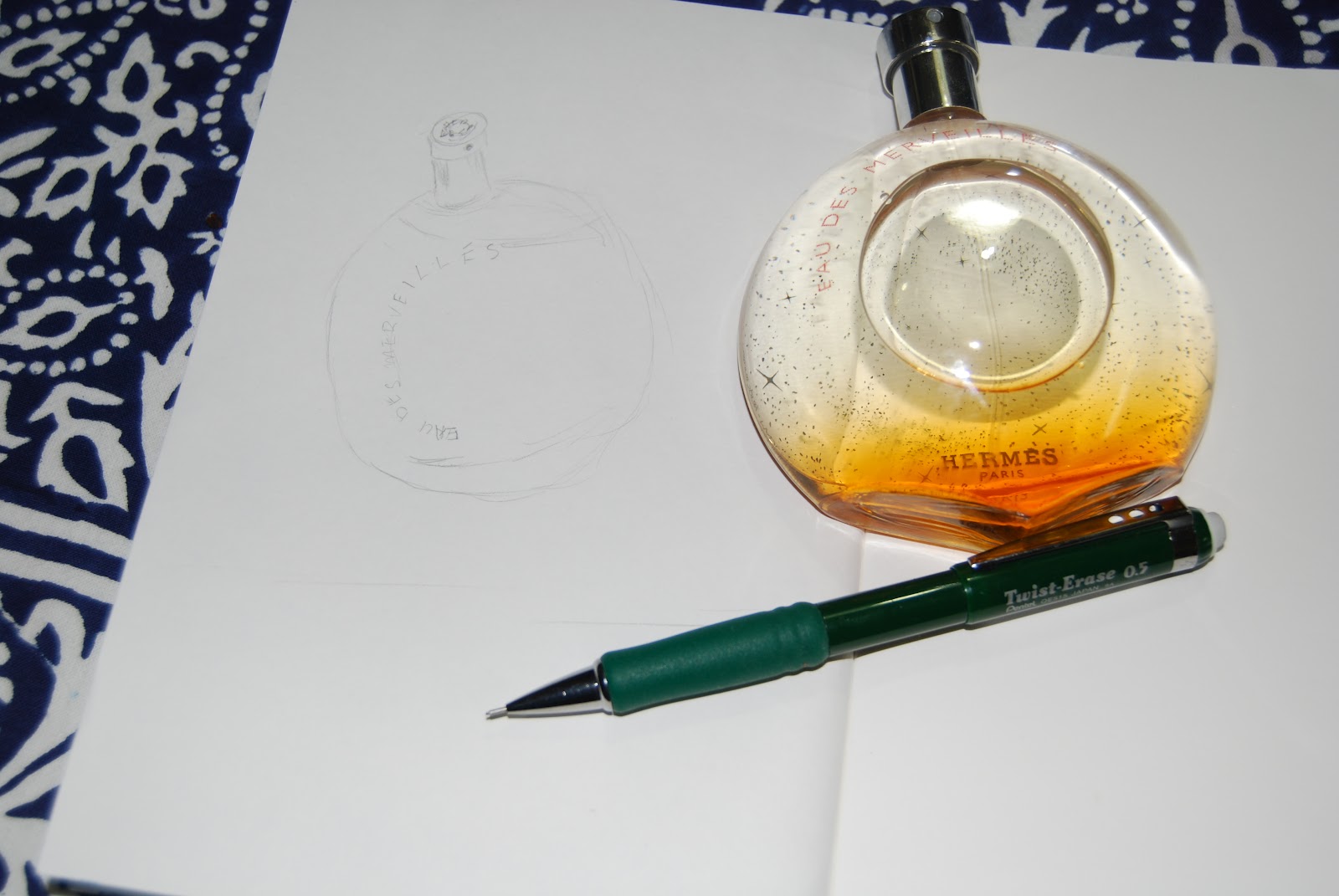 I even hauled out my neglected sketchbook to try to capture the bottle’s sleek and sparkly art. . .