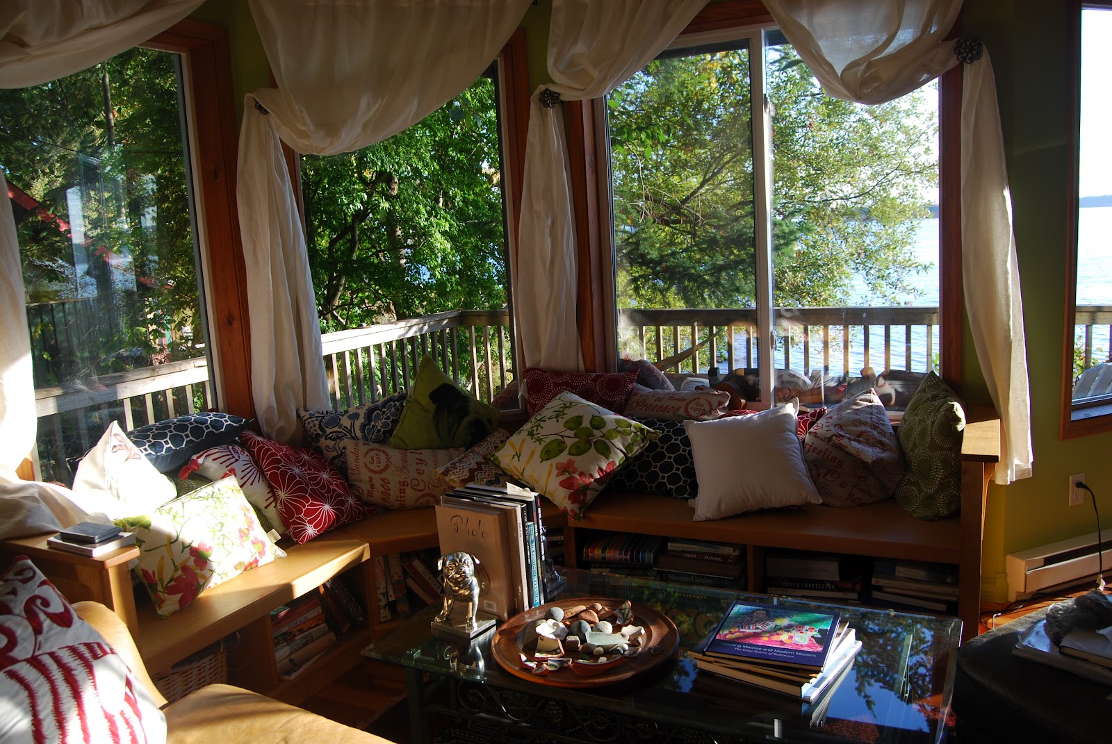 What a wonderfully inviting room this is! The view, the sofa and pile of pillows that says "dive right in!" and those soft curtains… enjoy!