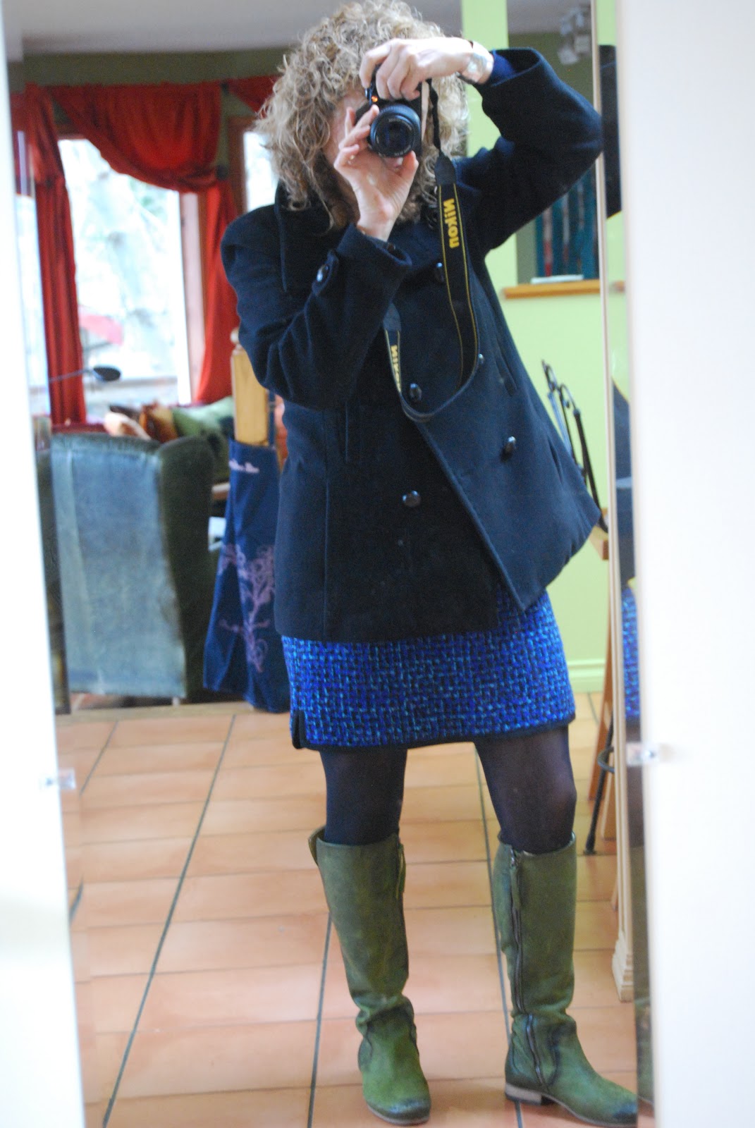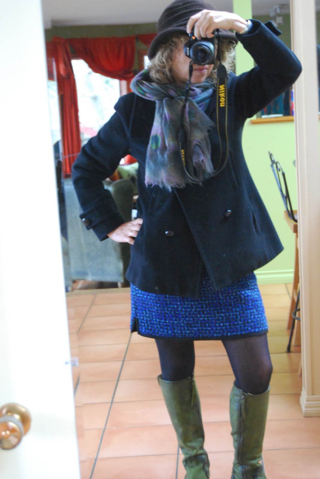 I must say you look flirty (but not too flirty!) in this ensemble. The boots and the skirt are perfect together. The skirt length looks excellent on you, and it's the colour of jewels. how could that be wrong?! I like short skirts and dresses, but I do feel more protected with tights, and if I'm feeling even more exposed, I go for jeggings. I would love to see you ride your bike in this, scarf flapping, red cheeks and nose. I'm glad you're feeling those good holiday vibes.