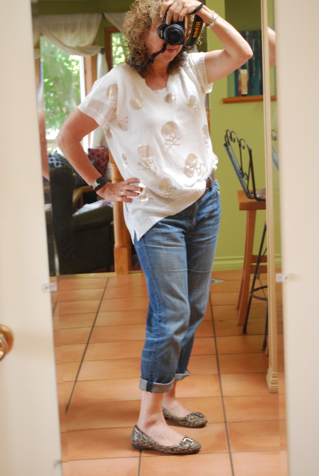 Really, the jeans are quite flattering and are what they are. Who is to say that "flattering" is some arbitrary standard imposed by a narrow few? Confidence, comfort in your own skin, with a sense of style and wit: These things all stand out to me even this the most comfortable and nonchalant of outfits.