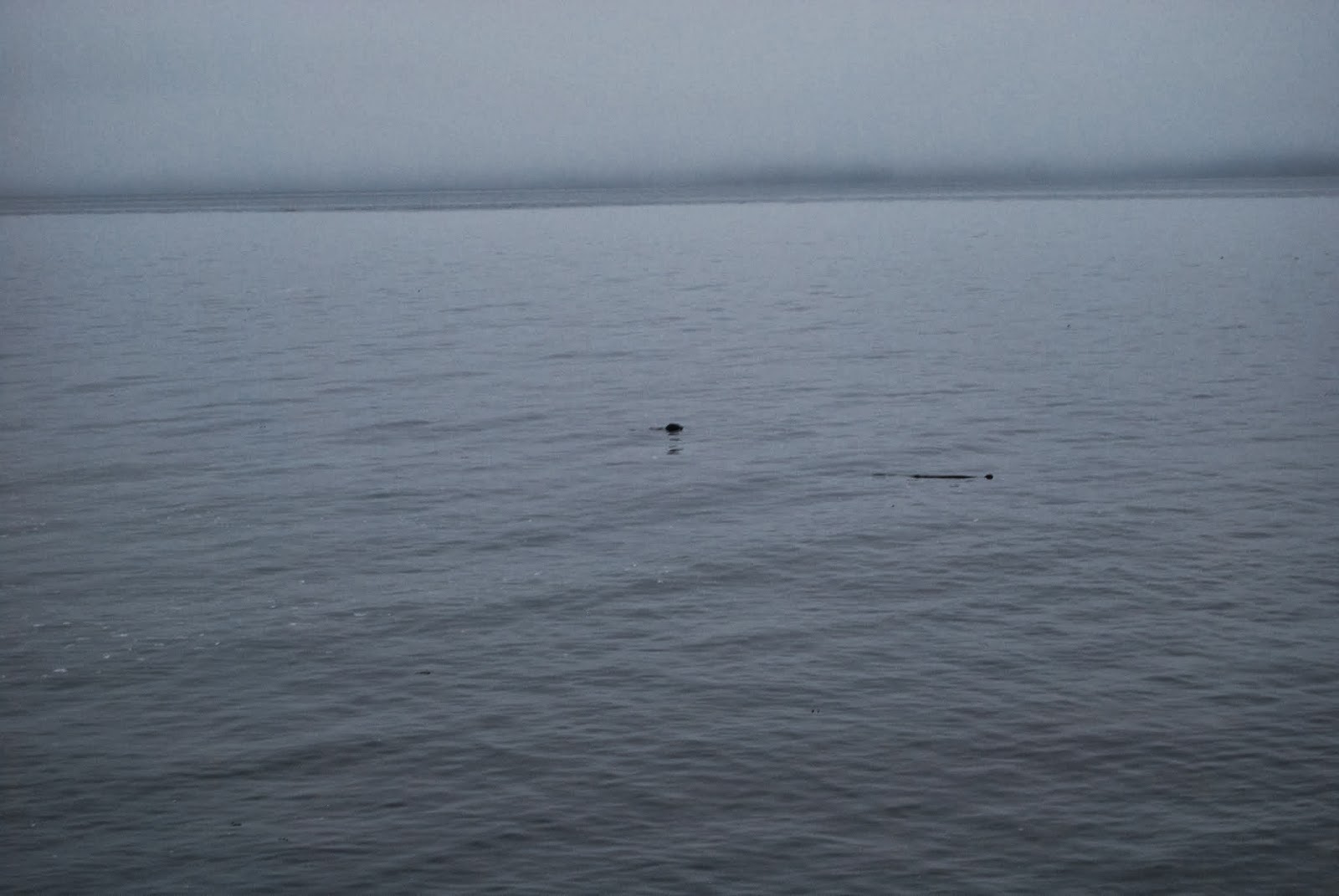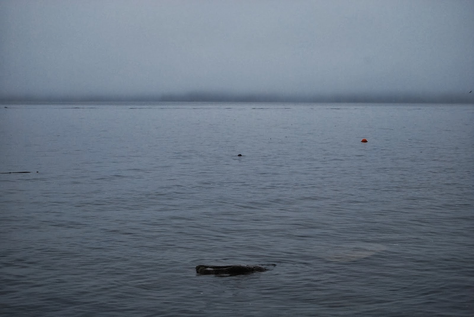 This is a very persistent fog . . . Monday morning, this boat cruised by to offer some variety against a palette of grey. . . .