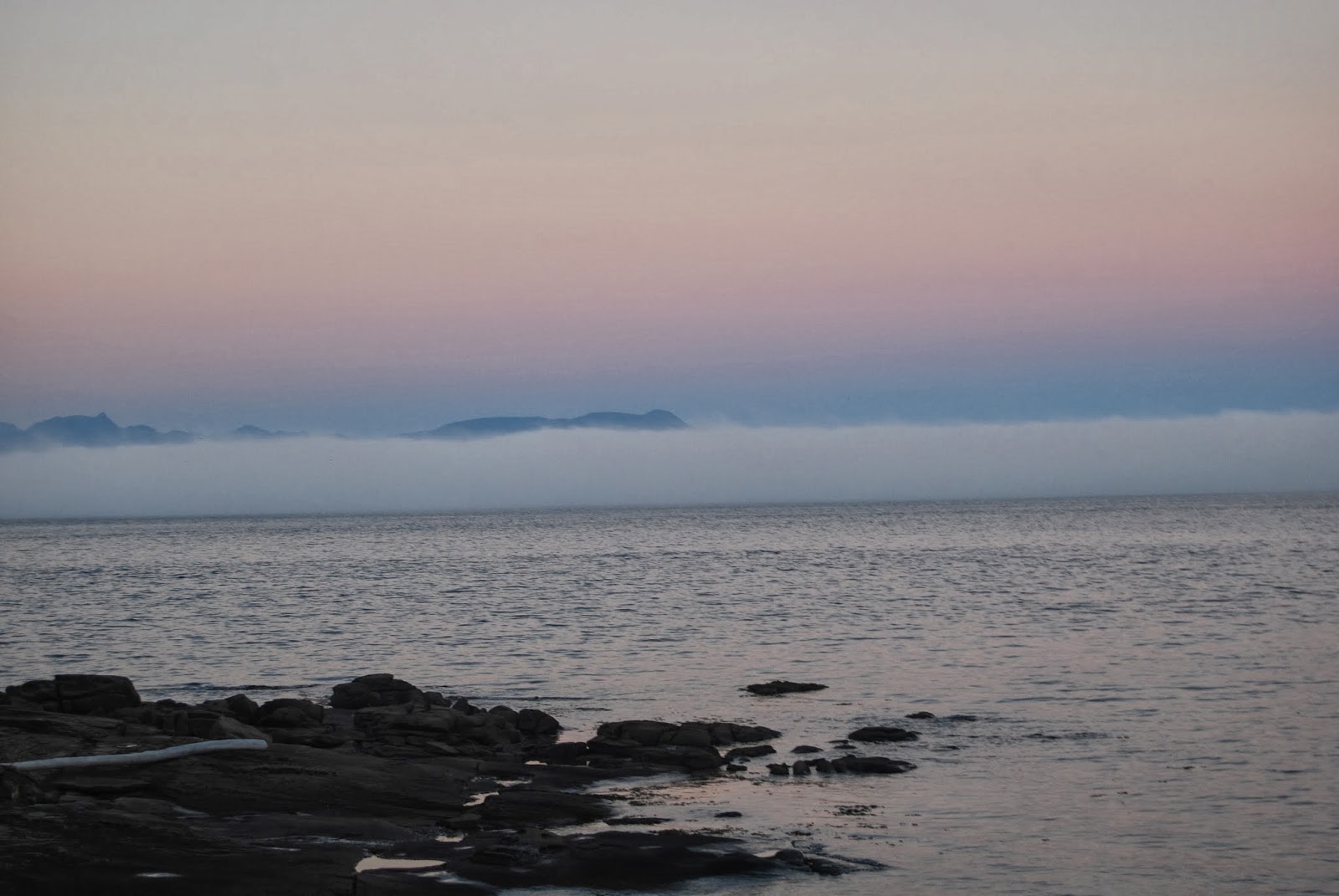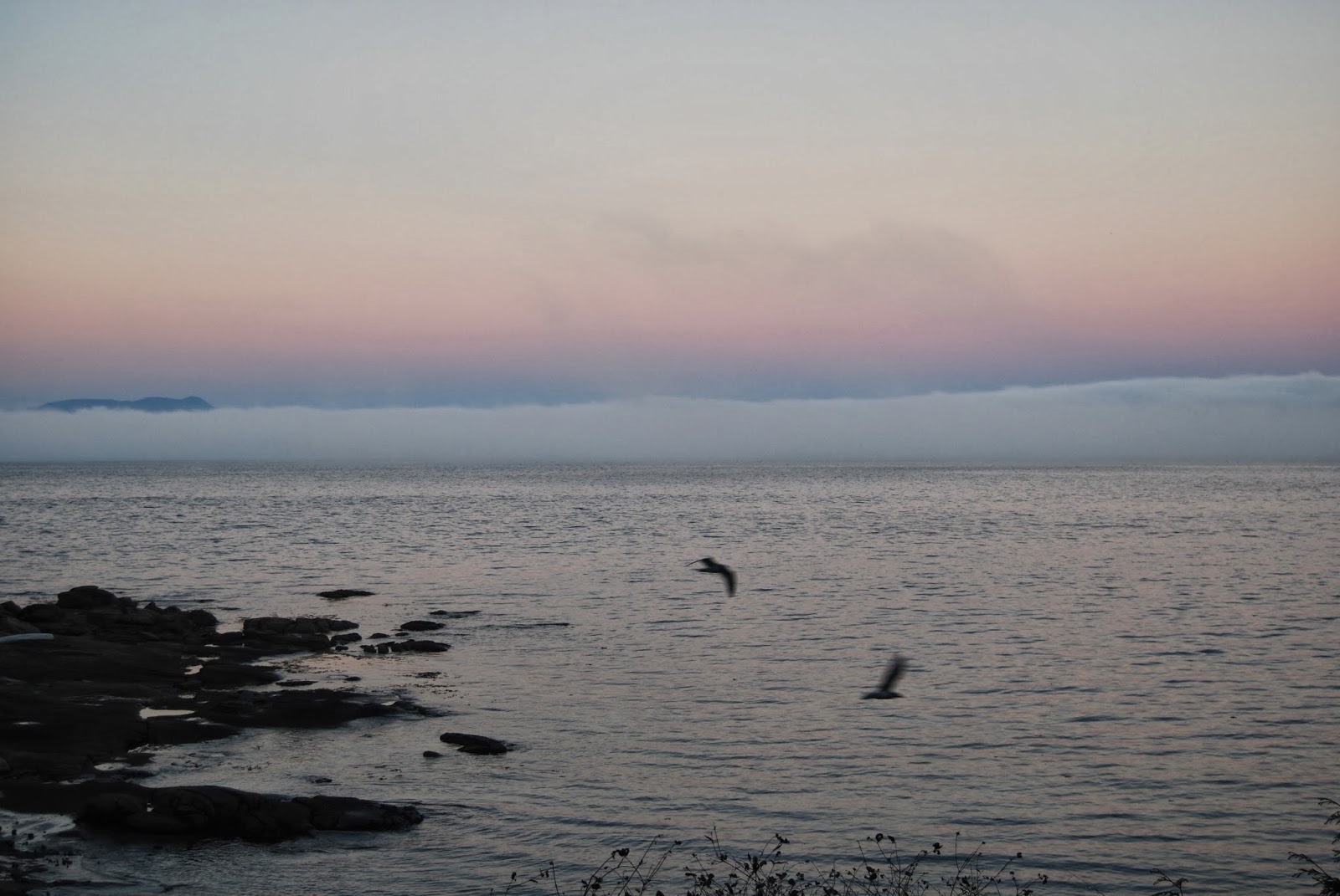 Then Tuesday, just before dusk, sunset was decorated by the unfurling of a thick roll of cloud-on-the-move; honestly, it was a bit frightening, gliding moodily, inexorably — and surprisingly quickly — across the water from the larger nearby island. . . . even the seagulls were alarmed. . .