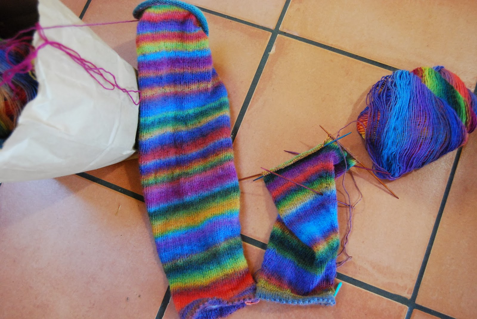 5. And, finally, since we’re talking about rainbow palettes, my latest (and seemingly interminable) knitting project: rainbow pants for Nola.