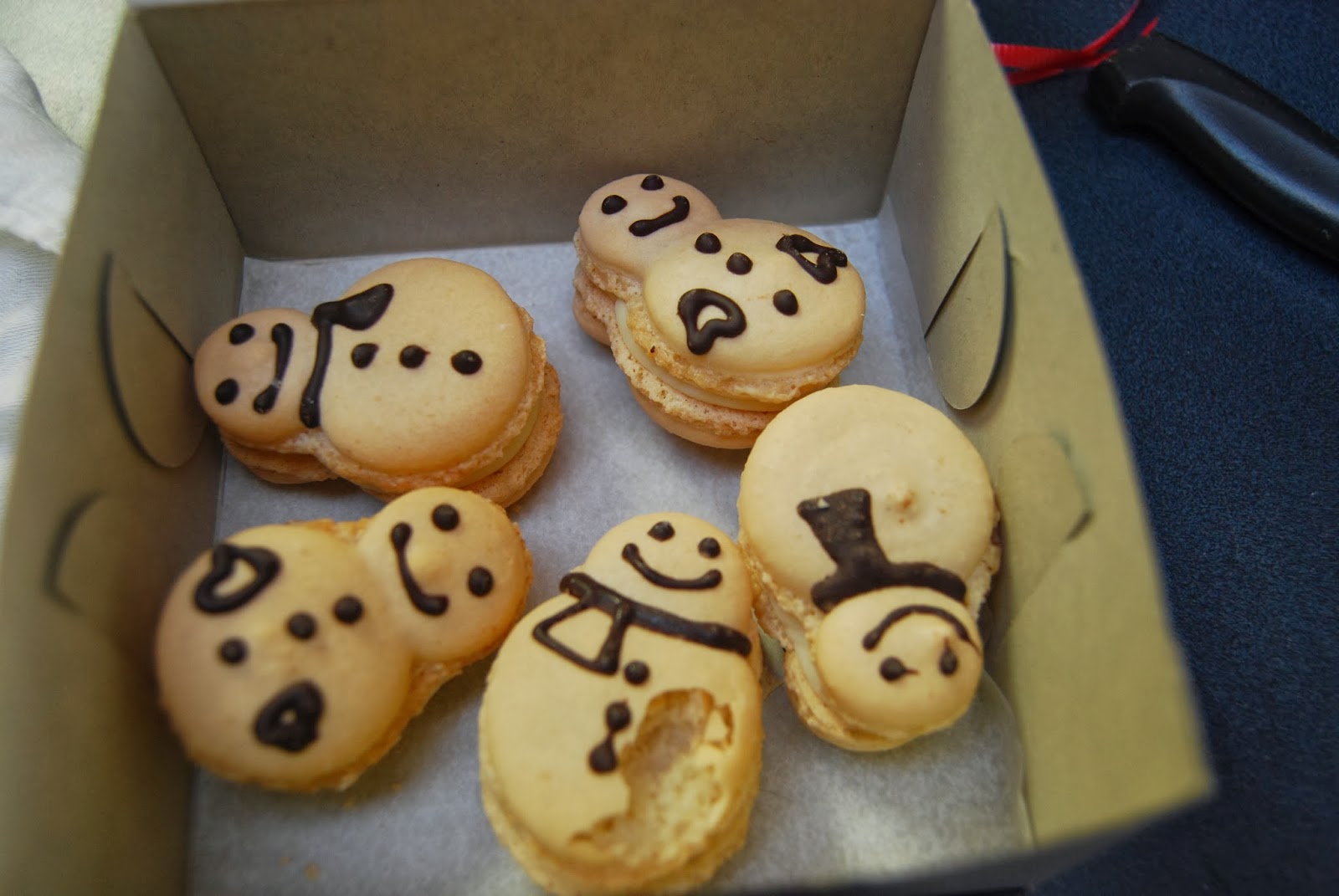 to reveal a little surprise. . . Just the day before, Sue’s post on macarons had nudged me in this direction, but there was still a chance I might have resisted the treat had they not been so cunningly tricked out as little snowmen. Perfection, no? You couldn’t have resisted either, right?