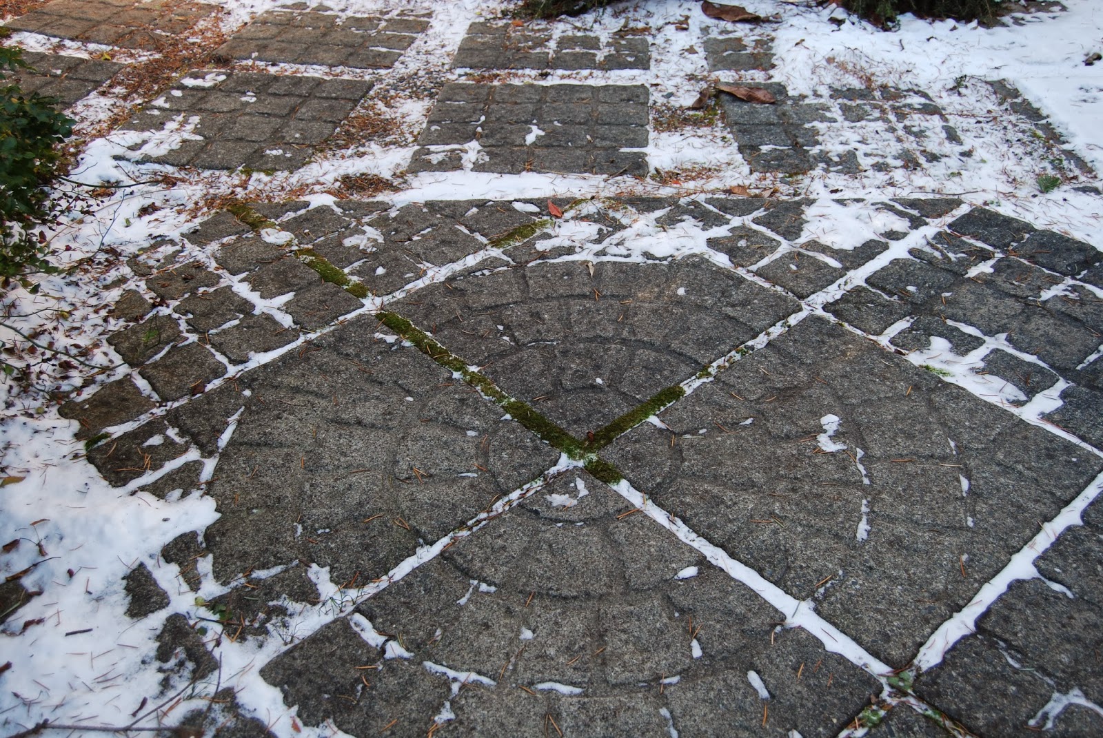 Meanwhile, I swept the light skiff of snow off the walkway . . . (I love the way the moss is beginning to fill in the pattern . . . )
