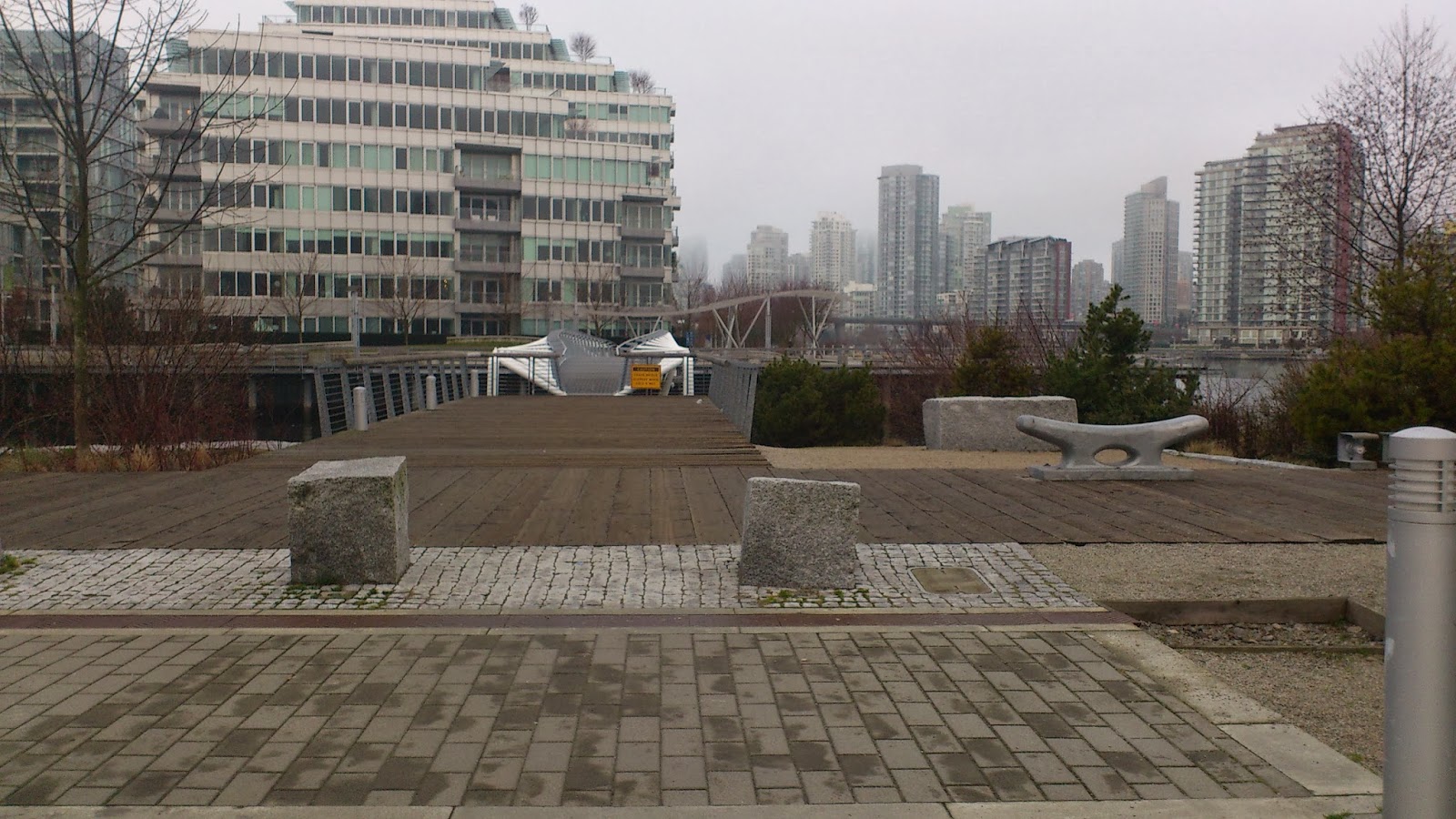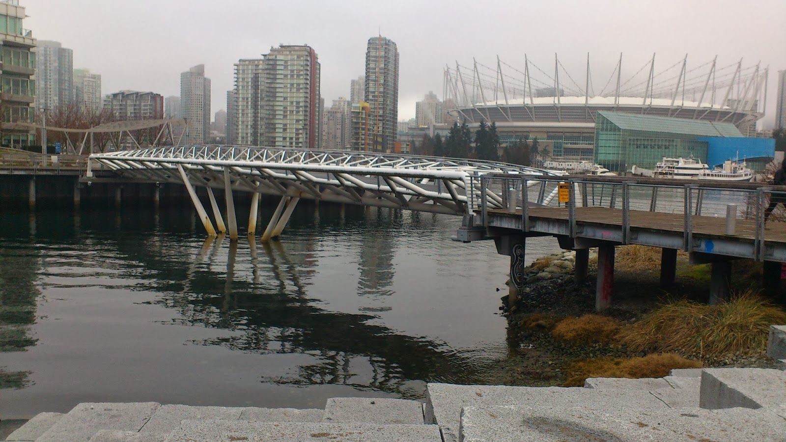 Here is a beautiful little pedestrian bridge that’s as much sculpture as infrastructure. It’s called The Canoe Bridge, and although my photos don’t at all do it justice, perhaps you can put the different angles together with your clever minds’ eyes and see the potential. It’s a homage to the canoes that have plied (and still do) these waters (False Creek, Vancouver, in this case) since time immemorial, carved out of huge cedar trees by First Nations people, steamed into shape, paddled skilfully through these waters which were forested to their shores.