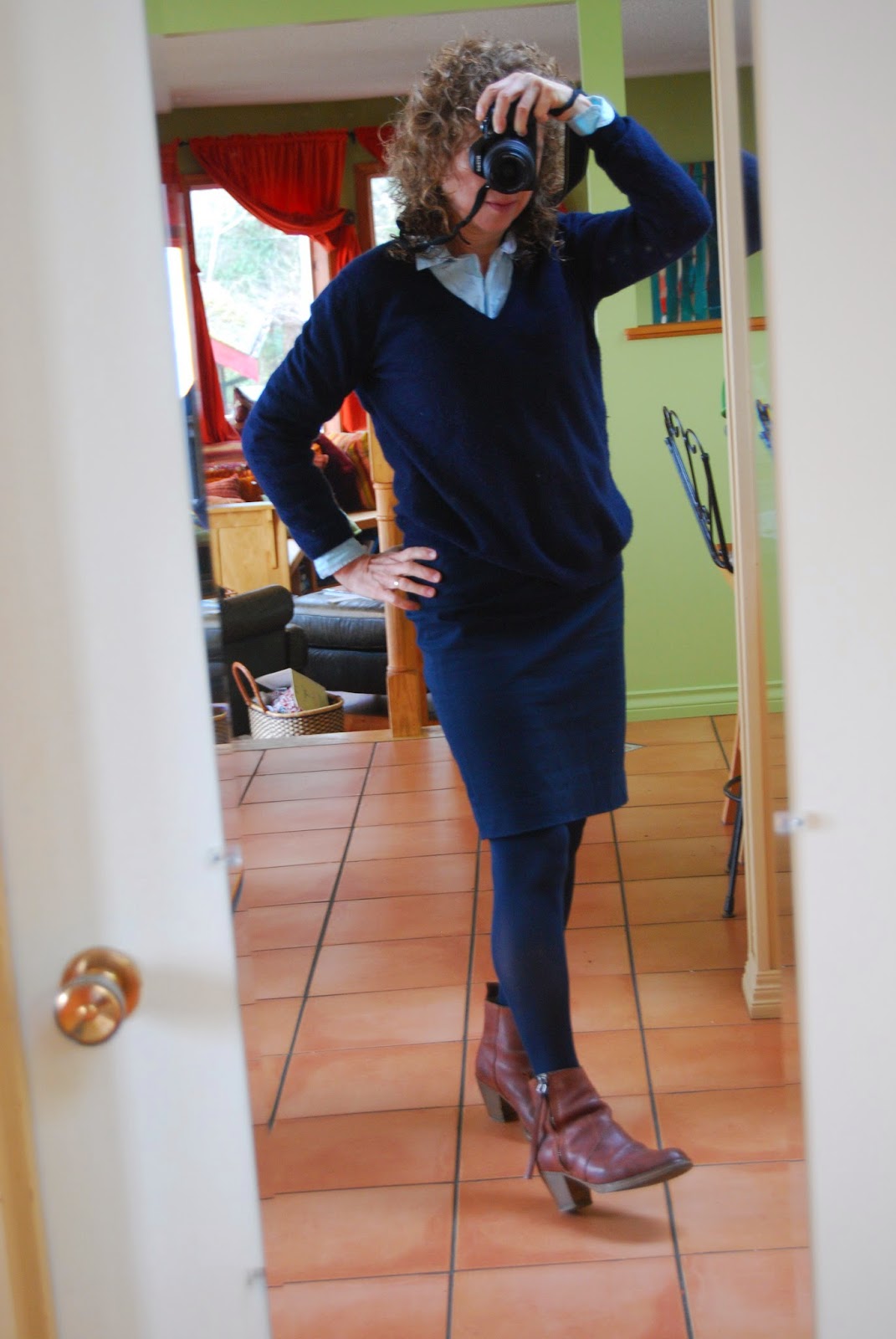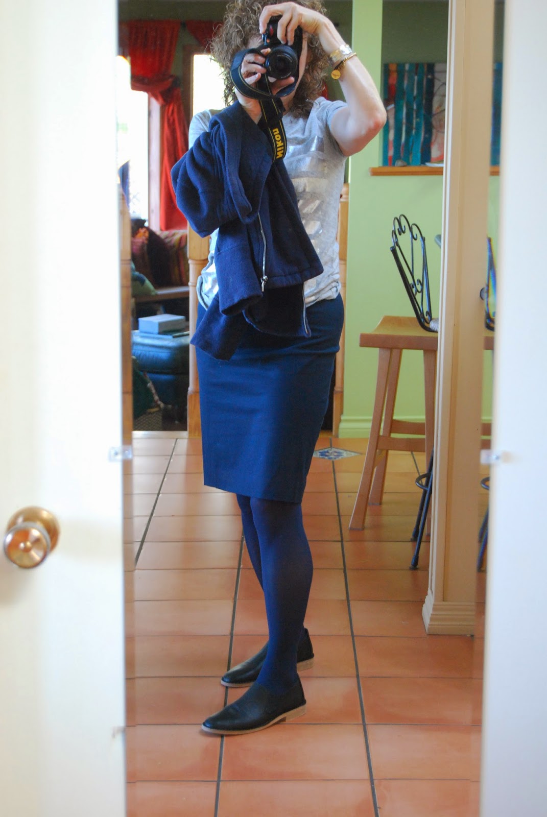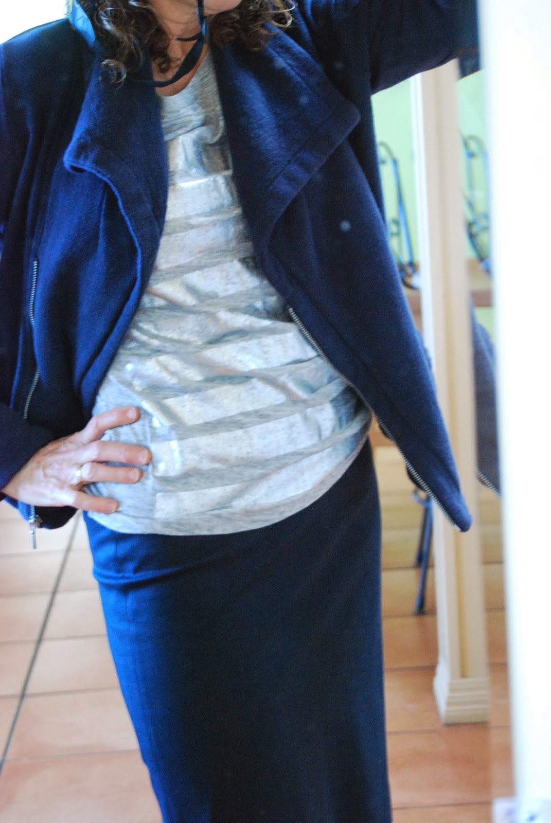 Your navy looks bright and chipper, but I wore navy to hide when I was in my teens (black was out of the question then), so I am deliberately trying to include more navy in my life now, when I'm not hiding. I must say you have provided encouragement; I even considered taking up running (and rejected the idea immediately, thank goodness, but I will probably find another way to supplement my regular strenuous walks, since I can see that such efforts have paid off for you).