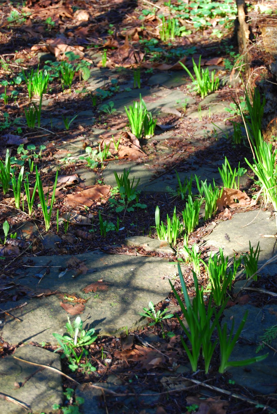 And even those plants that aren’t giving us flowers yet are painting the walkways and garden beds in all sorts of delightful ways — here a bit of chiaroscuro, brightened by the sharpest, sweetest greens.