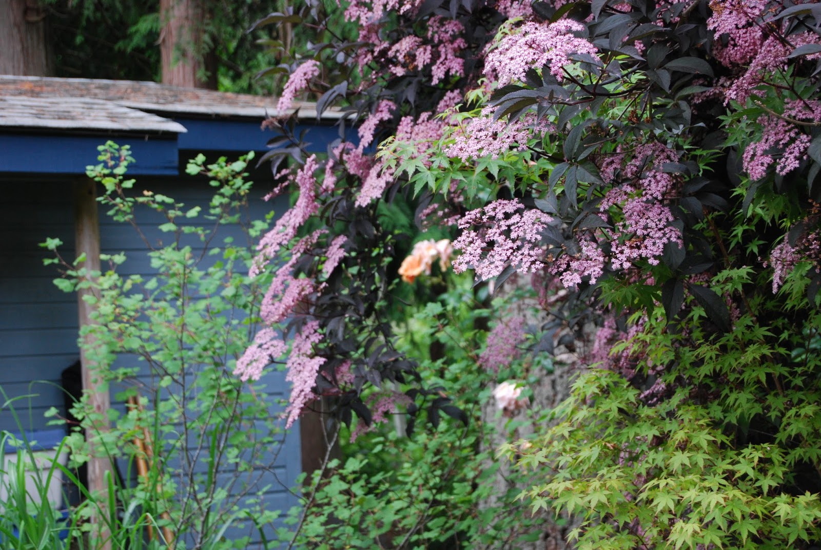 wow, your sambucus is a bit more intensely colored than mine which I THINK was purchased under the same name, and which has been amazing for the last 3 weeks, blooms now going by. Mine is right out in the front garden and I am always amazed that people just drive/walk by like it was not one of the 7 wonders of the world. I've only ever seen one other one "in person" – don't seem to be very common around here, perhaps because they spend the winter looking like a bundle of dead sticks if not cut back, or like a bare place if wacked away (I'm never sure which to do……).