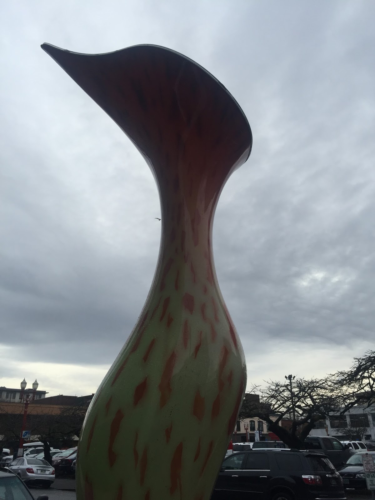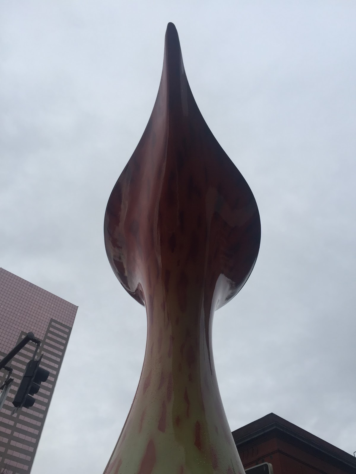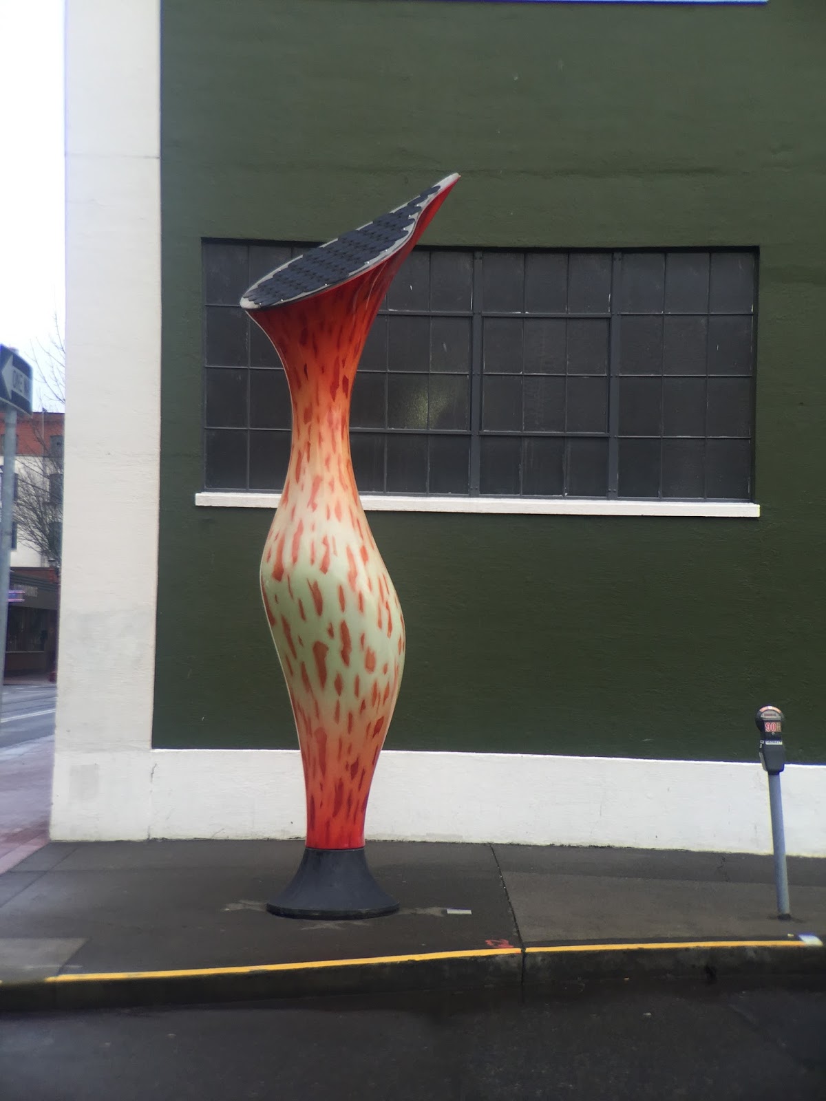 But I promised last post to show-and-tell you more about this sculpture, introducing glorious curves into a rectilinear context and sparking a dialogue between buildings and colours and spaces. More than that, the sculpture brings Nature into the conversation. It’s one of several (I’ve got photos of two more) made by Dan Corson of fibreglass, steel, a photovoltaic system and LEDs, so that it glows, although I never managed to get back after dark. The sculptures are titled Nepenthes, an acknowledgment of their inspiration in the carnivorous plants more commonly known as Pitcher plants, of which there is one native to Oregon. The plants draw their name for the mythical Greek potion, antidote to sorrow and suffering.