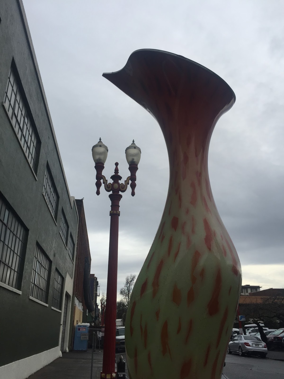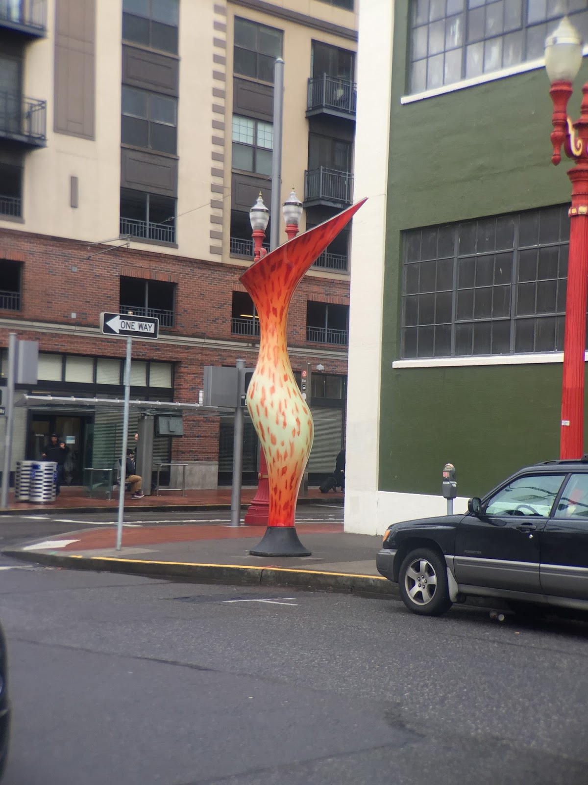 But I promised last post to show-and-tell you more about this sculpture, introducing glorious curves into a rectilinear context and sparking a dialogue between buildings and colours and spaces.  More than that, the sculpture brings Nature into the conversation.  It’s one of several (I’ve got photos of two more) made by Dan Corson of fibreglass, steel, a photovoltaic system and LEDs, so that it glows, although I never managed to get back after dark. The sculptures are titled Nepenthes, an acknowledgment of their inspiration in the carnivorous plants more commonly known as Pitcher plants, of which there is one native to Oregon. The plants draw their name for the mythical Greek potion, antidote to sorrow and suffering.