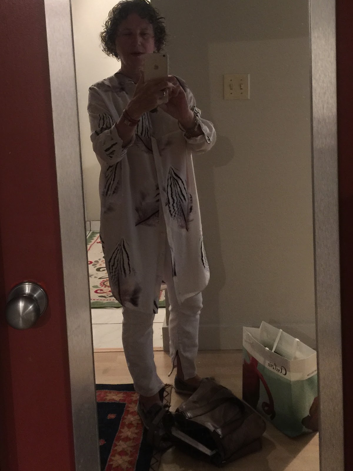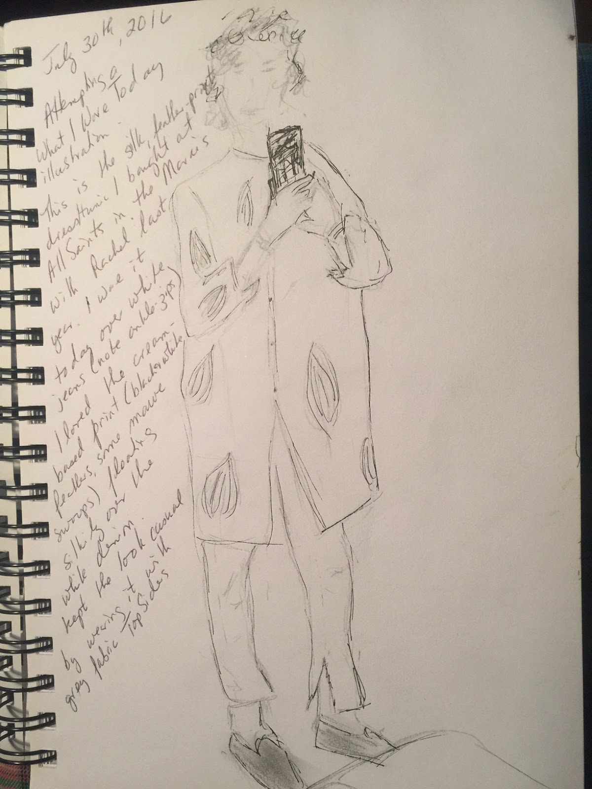 And while I’m sharing Selfies, here’s a (yes, way too dark) photo of an OOTD I wore and liked recently (the floaty silk All Saints dress — seen here worn with bare legs and boots — worn over my white jeans with grey-denim loafers) enough to have tried sketching it.