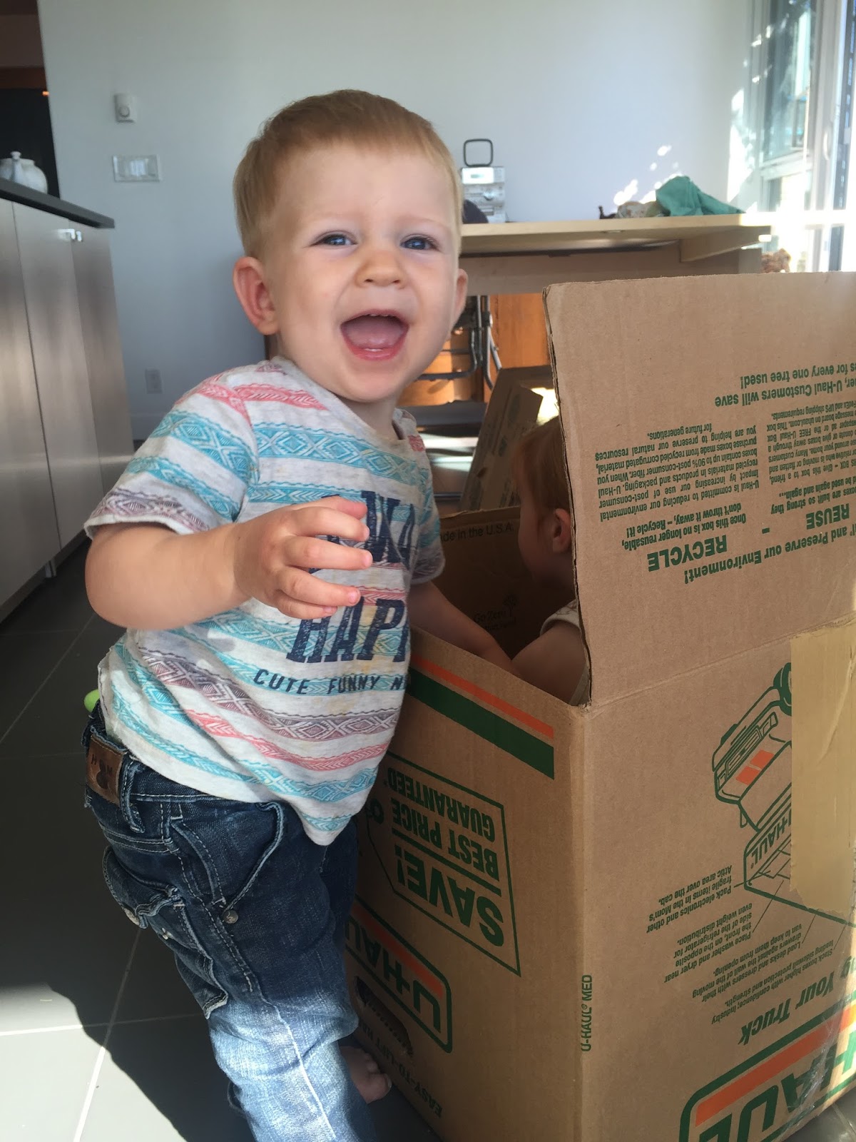 Surprising how much fun you can have at Nana and Granddad’s new digs with a few empty packing boxes. Seven-year old G’daughter constructed fifteen or twenty feet of tunnel with them on the weekend — and convinced Nana to belly-crawl through them after her! — and a few days later, the Three-year old G’daughter folded herself into one and pulled the lid down. Little Brother thought this might be the best game ever. . .