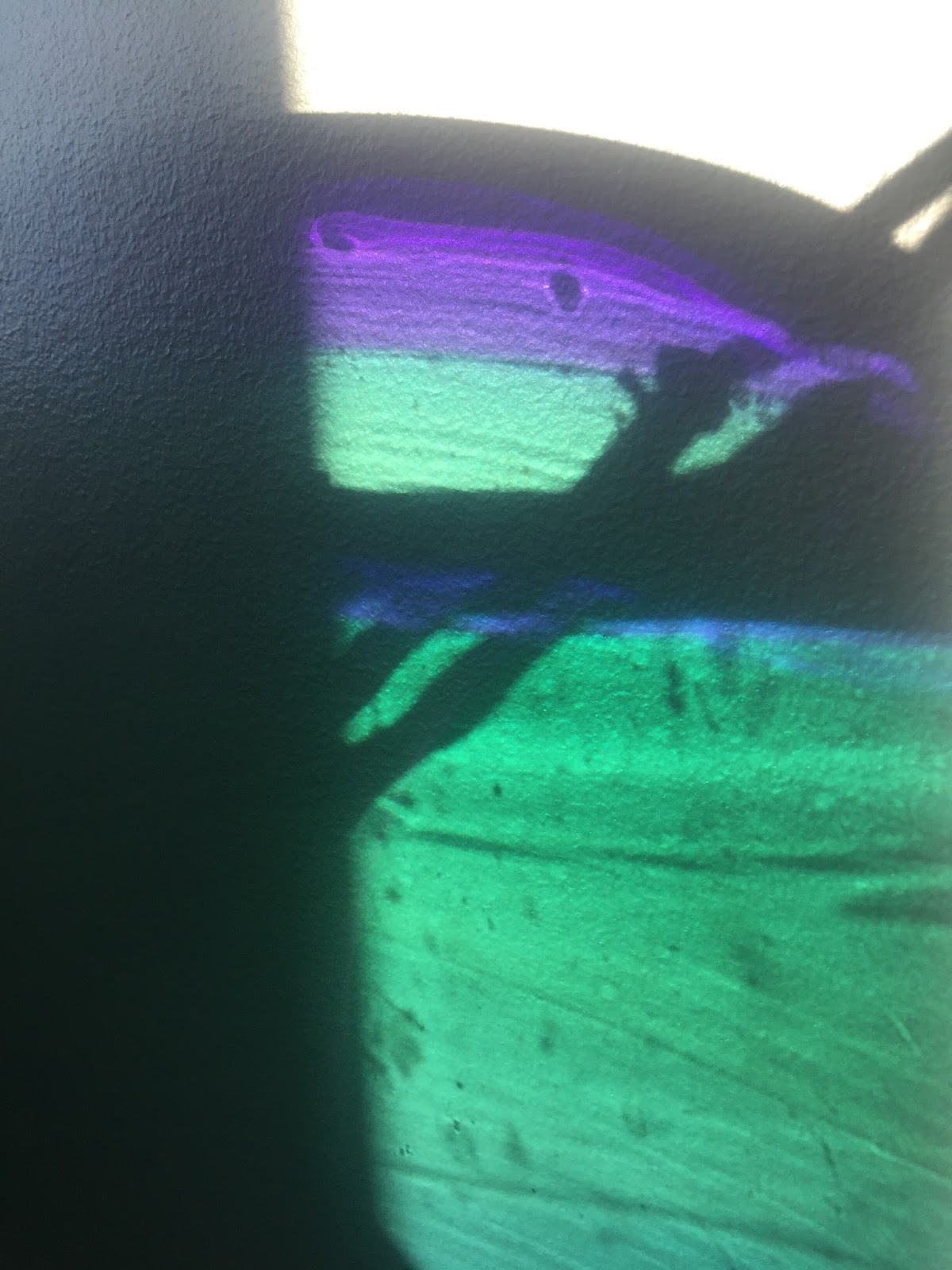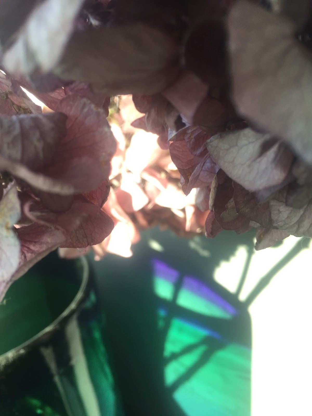 I followed his orders dutifully, so was lucky enough to catch a few magical moments when the afternoon winter sunshine pierced a large hand-blown glass vase I’ve placed in the corner of our room; last September, delighted at having a large potted hydrangea in our new terrace “garden,” I’d tucked a few stems in the vase to dry.