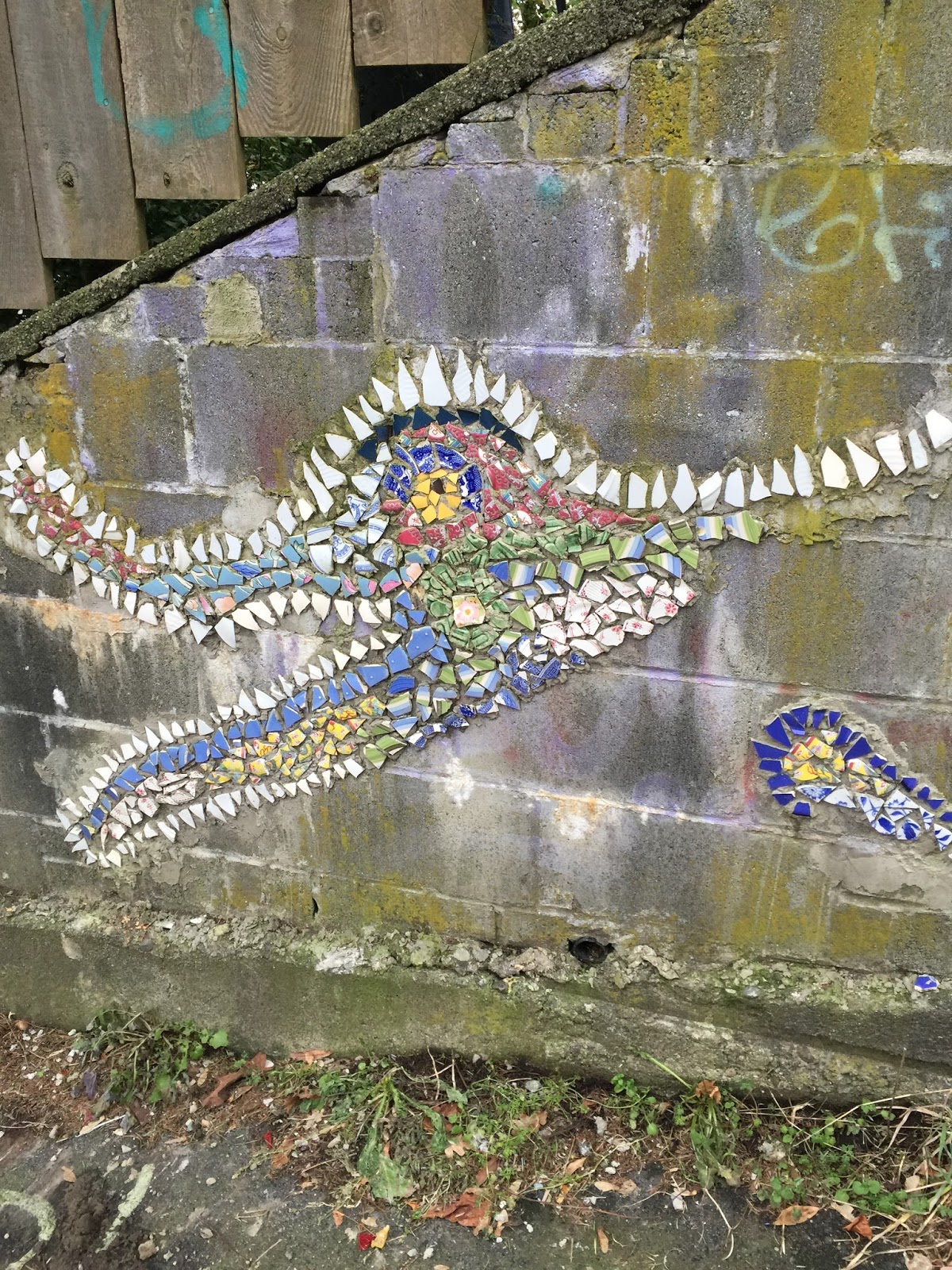I love that dragon made of shards. It reminded me that a few years ago I decorated a flower tub with fragments of plates and cups. It has some technical flaws, but it is still in use. There is a beautiful book about mosaic making by (textile designer) Kaffe Fassett which inspired me to just have a go at it. Since that time there is a big box of broken pottery and tiles sitting in a shelf and waiting for the moment when there will be time for more…