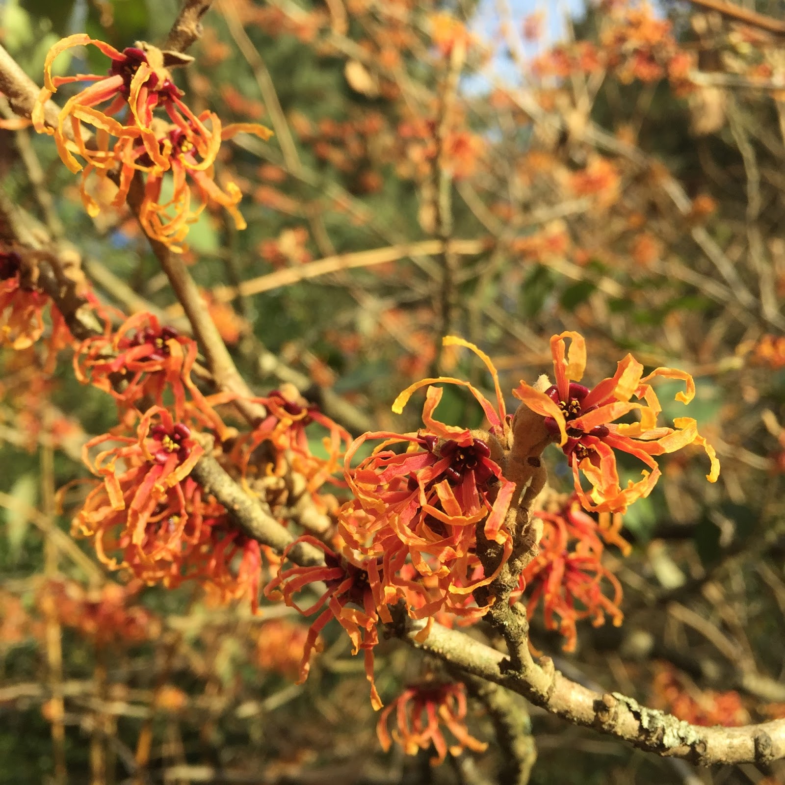 And the most glorious day for Witchhazel, various types of Hamamelis blooming throughout the gardens — stunning in the winter sunshine (although I would imagine they’re also looking quite magical today, against the snow, and I quite love them on a foggy or rainy day when their colour brightens the gloom).
