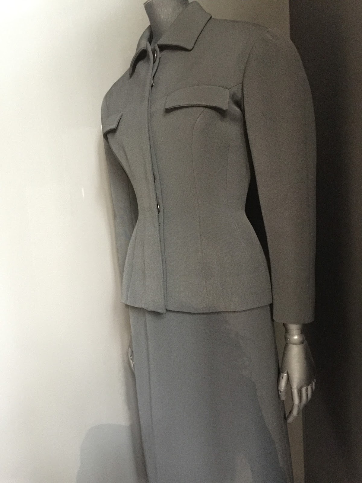 I might wait until I’m back home before I do a separate post or two out of the twenty or thirty photos I took — the posts I published of another couture exhibit (featuring Madame Grès) at the Musée Bourdelle are among the most popular of anything I’ve ever posted here (yes, there are four separate links there — a whole lotta dresses!), so I know there are many of you who will appreciate the sharing, even if the black reads as grey, and a photographer of a certain age casts her shadow across the skirt of a brilliantly strict suit.