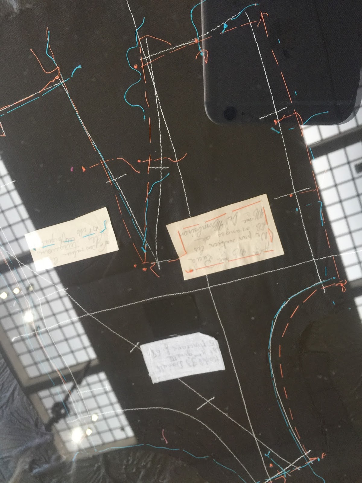 I will say right away that my limited photographic skills were overwhelmed by the triple challenge of photographing black fabric (the show is called Balenciaga: L’Oeuvre Au Noir), the lighting, and the reflective surfaces (as seen below).  The photo above is an attempt to show Balenciaga’s system of coloured threads and attached notes recording modifications to a pattern. The pattern pieces are held in the glass case pictured below;  you can see how the glass mirrors the mullioned windows and skylights of this stunning space.
