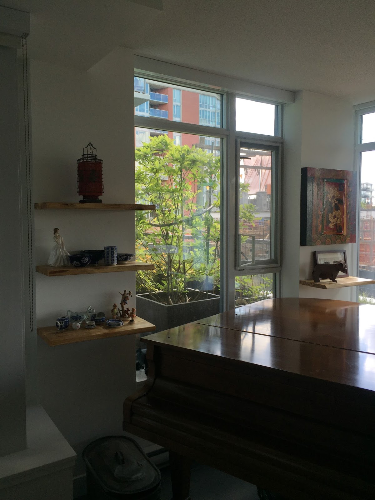 china ornaments. We lived in a small house but we never sat in the living room except with company. Life is very different now but I used to take my daughter through china shops whenever her father was working in Victoria. I've created a teacup collector. The light and expanse of your apartment will prevent it from being cluttered and the maple wood does integrate the inside and the outside.