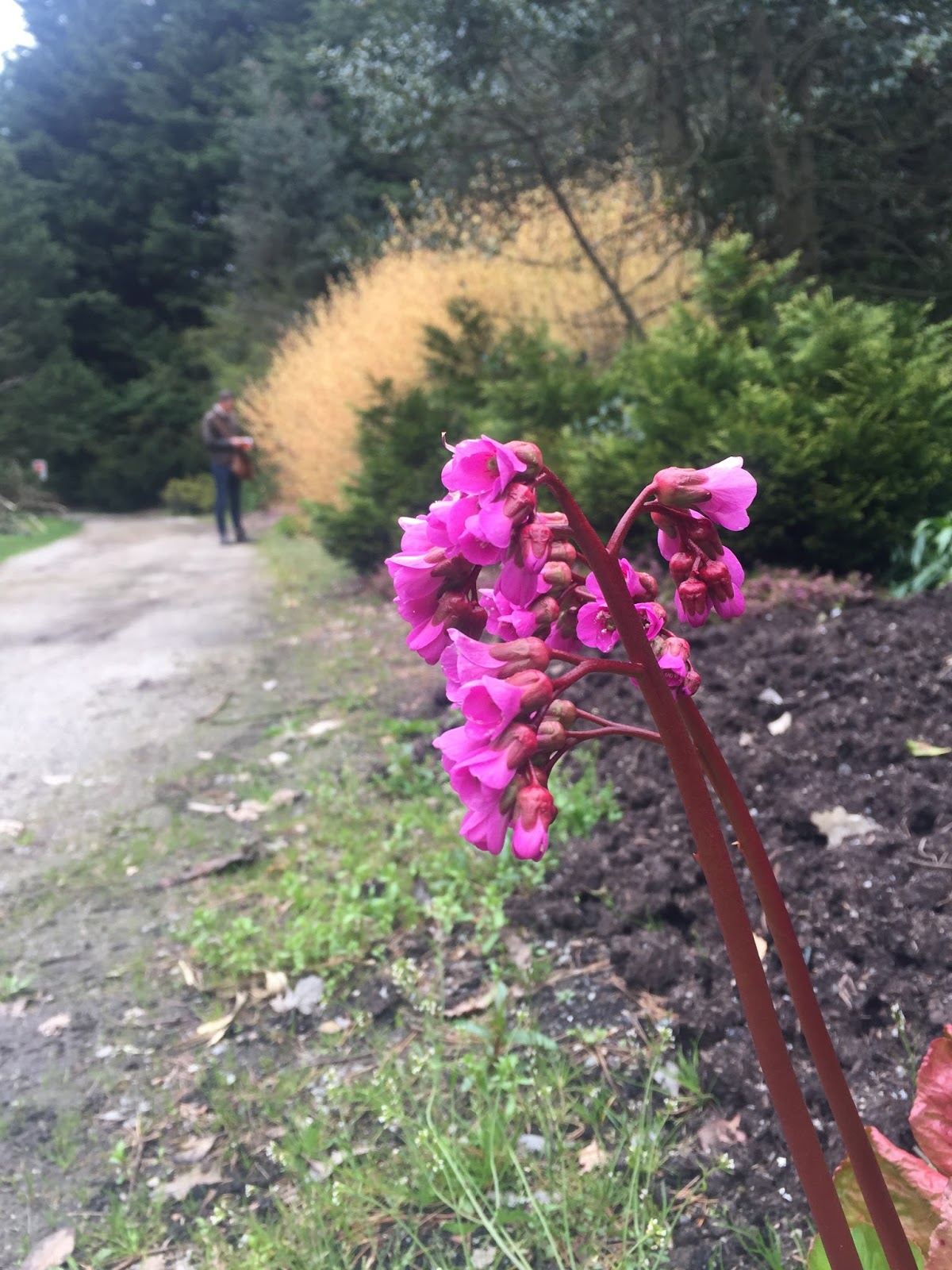 I have to say that I’m not generally a fan of Bergenia, but ths patch was quite attractive, and perhaps I’ll change my mind. . . . (and yes, that’s Pater in the background — he’s making a note of plant name details for his next visit to the nursery — stay tuned for news about one appearing on our terrace soon)