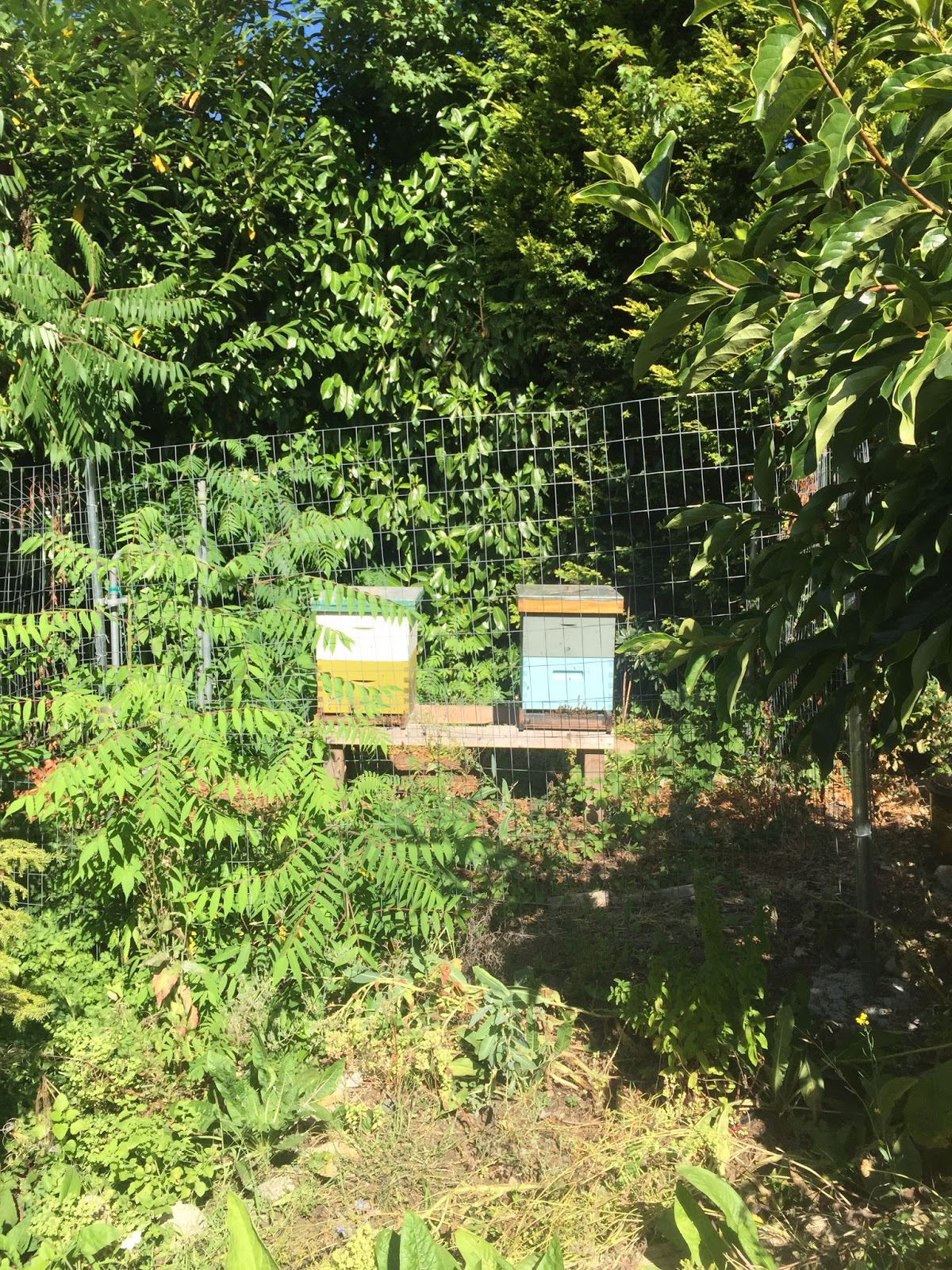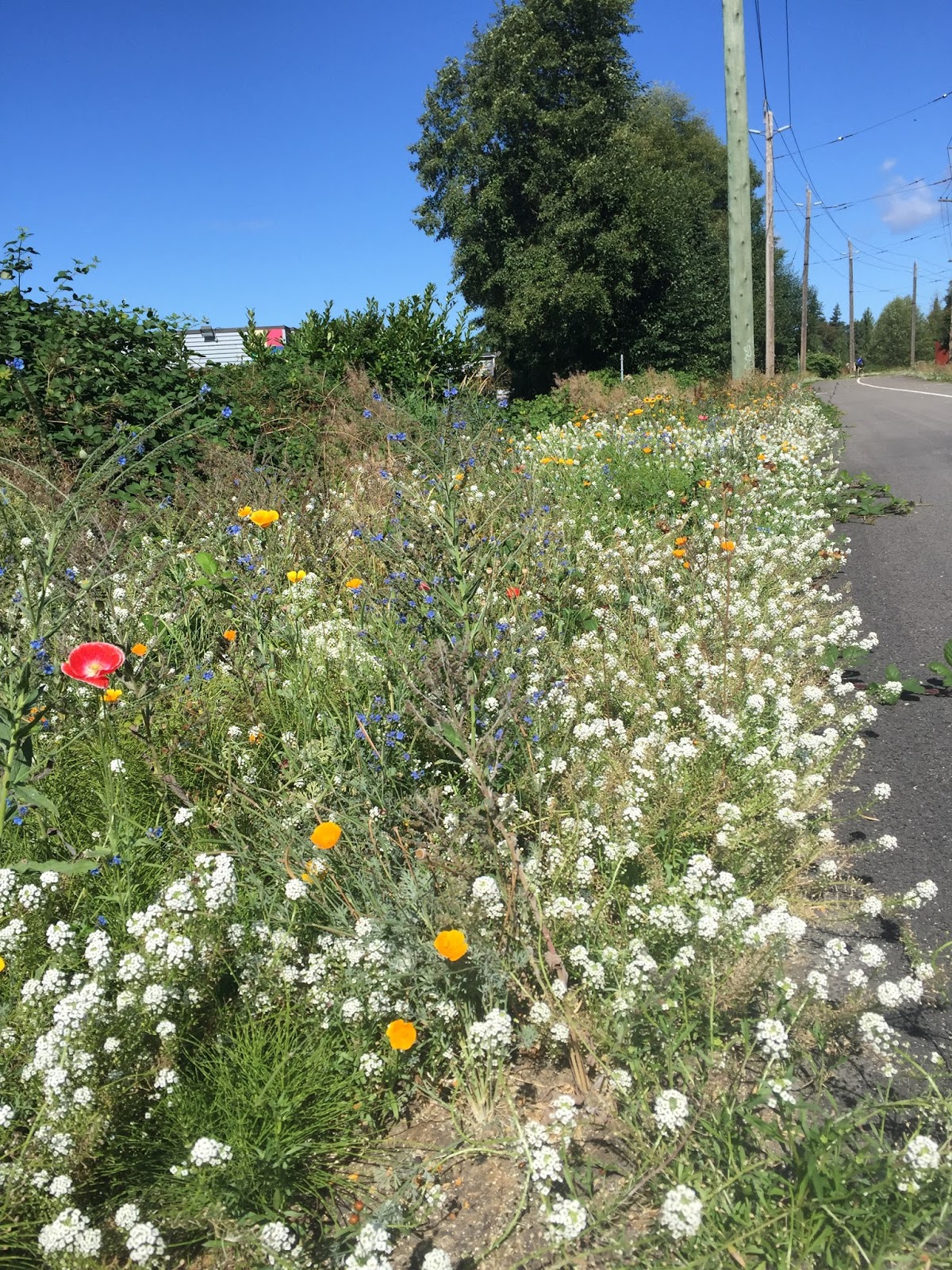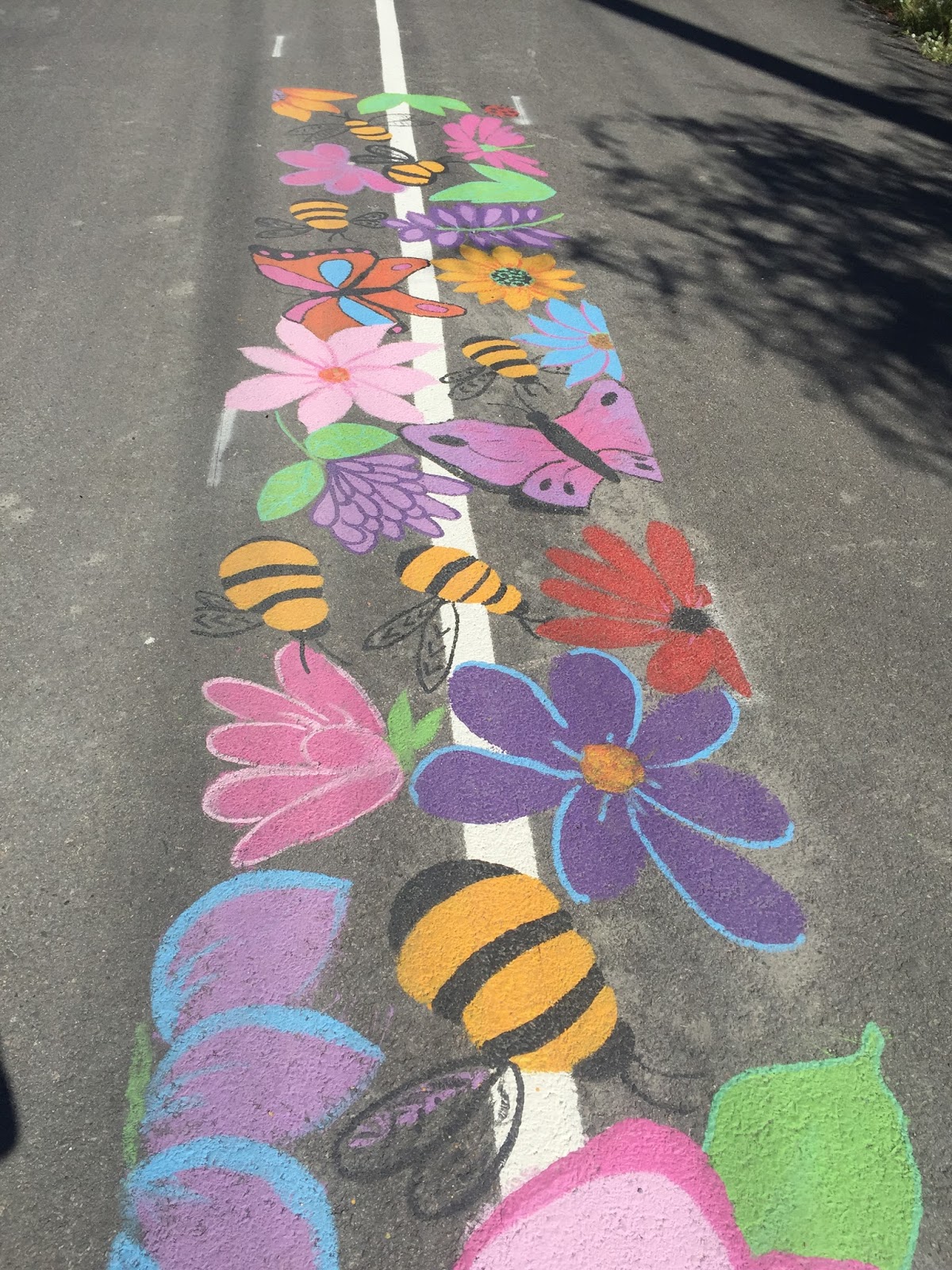 For now, though, since it’s Friday afternoon, and the last summer weekend before Labour Day cranks up all the back-to-school-and-work machinery, I’ll stop the over-thinking (which, honestly, isn’t “over” to me — it’s just process, and it’s okay!) to share some photos: the planting of honey-scented flowers bordering that bike path, the cheery flowers and bees and butterflies painted down the centre to invite the pollinators to the feast . . . and then the bee boxes tucked into the allotment gardens along the side. These bee boxes were the reason I’d wanted to pedal the route again (because I’d just written here about Paris bees and their hives; when I saw them the first time we biked the trail, Pater was a ways ahead and by the time I registered what I was seeing, it felt too late to bother stopping (although he’s very patient and wouldn’t have minded).