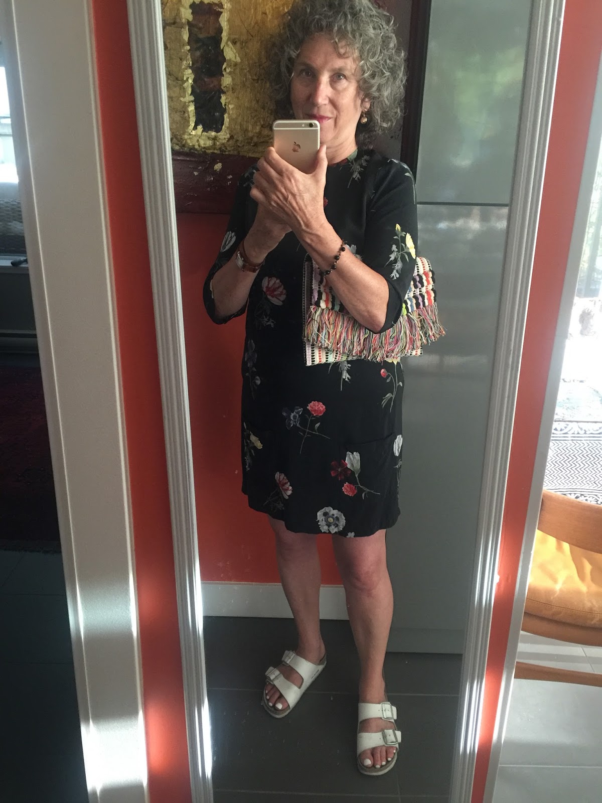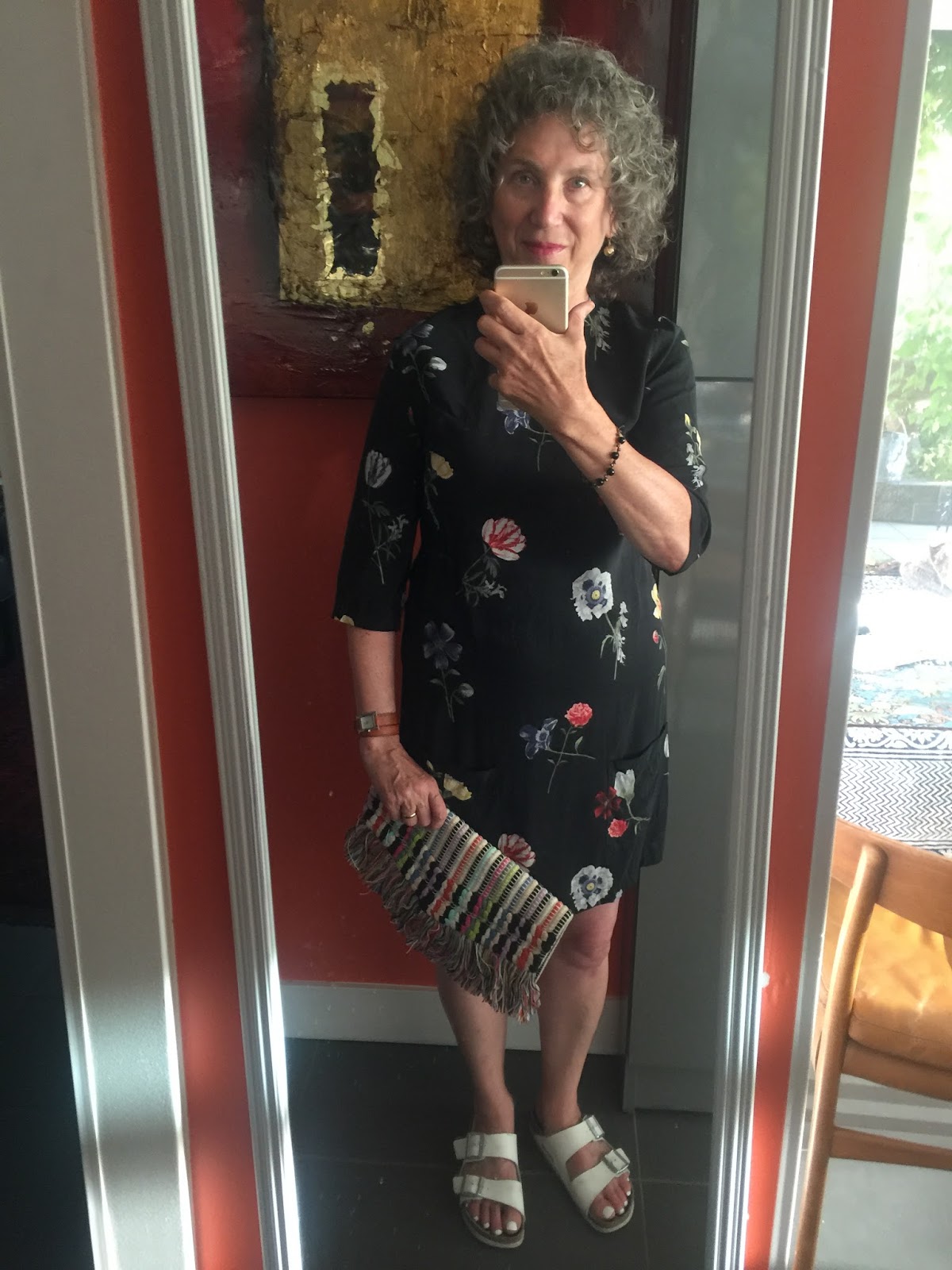 And I tried wearing it with a new clutch (Stella and Jo, bought via daughter in Rome). I thought the pattern-matching worked, and if you don’t, Well, you know what I’ve been seeing about pleasing ourselves! đ