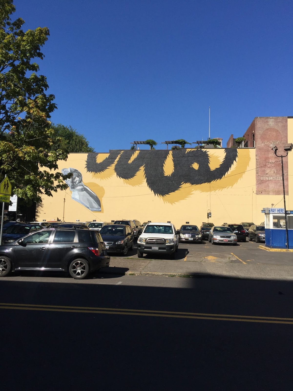 This mural . . . I’m still not sure, but it’s at least arresting. Is that a tail? Of what? And who is that fellow whose bust emerges below and to the left of the tail . . .
