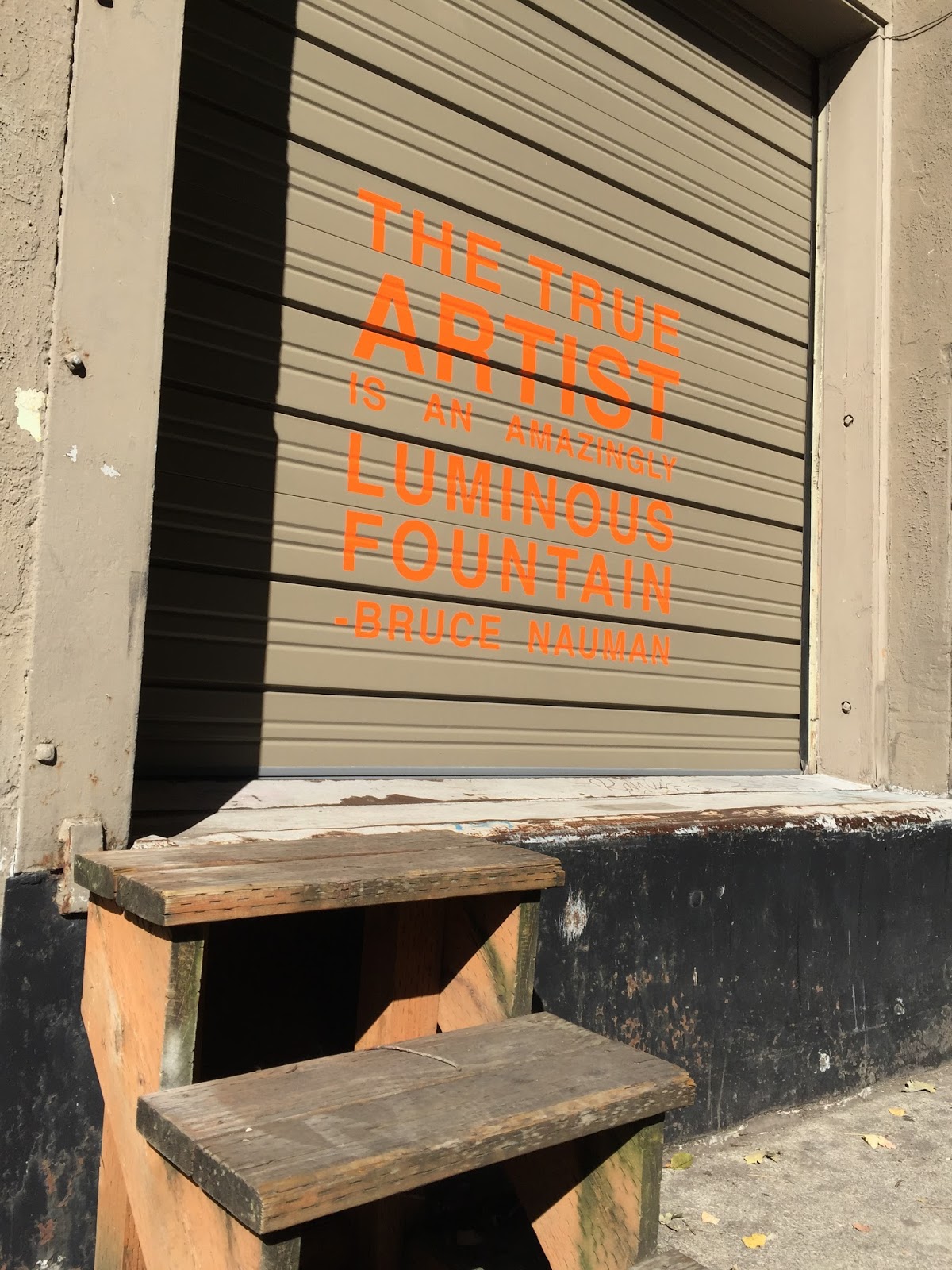 And a few blocks away, thinking about whether or not to go back and buy the shoes I’d tried on, I spotted more orange graphics — lettering again, more creative inspiration, this time in words by artist Bruce Nauman, “The True Artist Is an Amazingly Luminous Fountain” I love everything about this, the colours of background and text, the font, and the way that precise, sharp lettering contrasts the gritty, industrial patina of the wood and concrete below — those stairs. . . .