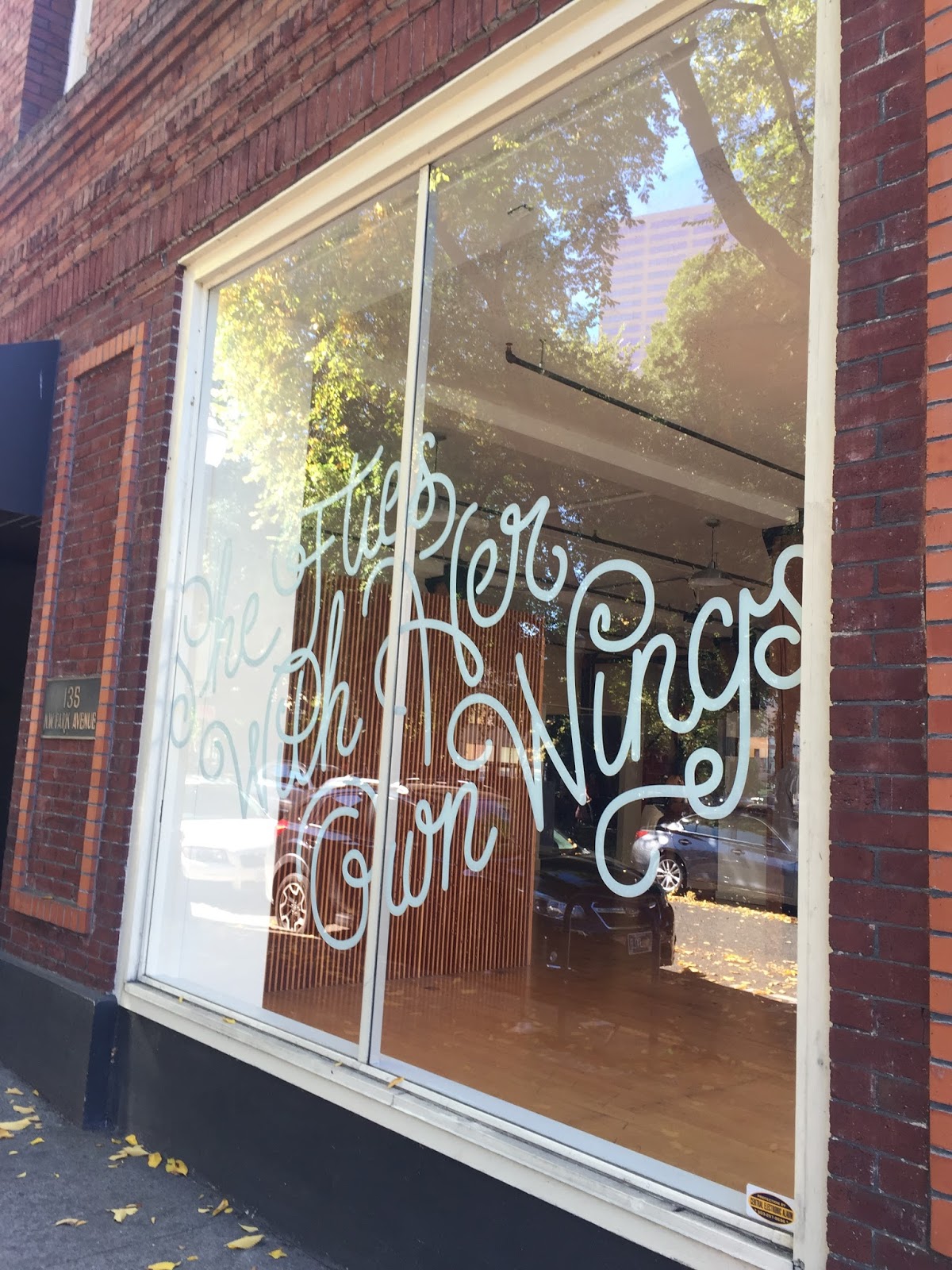 Much of what I love about just wandering is the way it can stoke the creative juices, and Portland is a very good city for that. The beautiful lettering on this window, for example, reads “She Flies With Her Own Wings.” . . . .