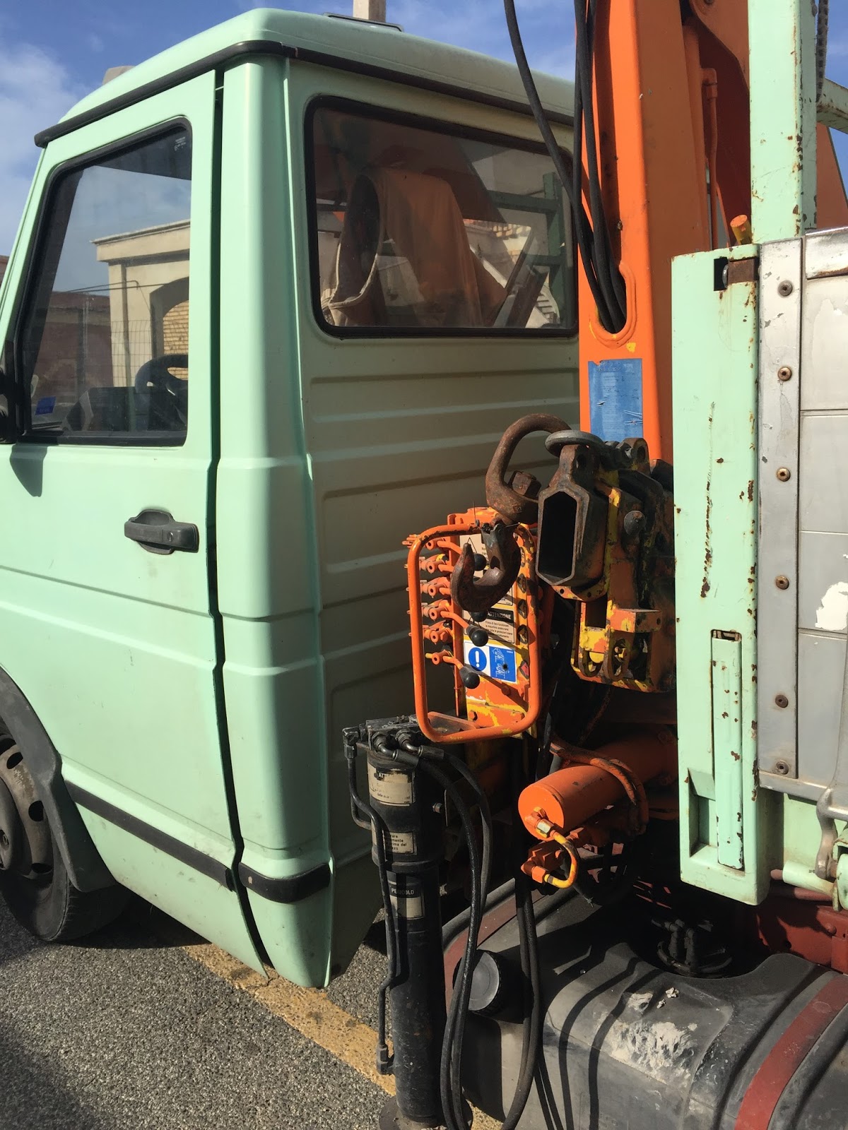I’ve already begun organizing the many photos I’ve taken. Today’s selection is all about colour, for me at least, about colour found in the daily rounds in some unexpected and decidedly unglamorous places. Top photo: a rusting water-fountain (nasone) against a sun-streaked, stuccoed wall; next: that truck’s minty green against the lift’s rusty orange, the gritty muscularity of the vehicle; below: two photos of a graffitied wall on a fenced-off portion of the beach, the faded graphics of the tin can that’s been caught up in the wire fencing, none of it romantic, even against that sky, and yet. . .