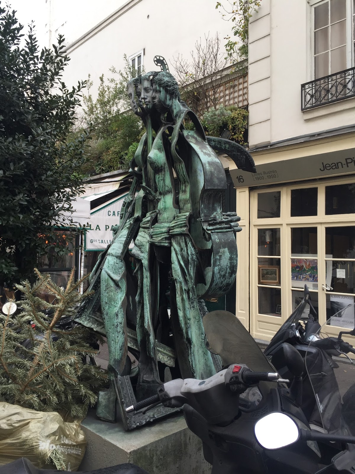 I did a bit of Googling, as one does these days, and found that this bronze sculpture Vénus des Arts, is a deconstructed Venus loaded up with musical instruments and drawing and painting tools. She was sculpted by Arman, and should you want to see her for yourself next time you’re in Paris, wend your way to 16 Rue Jacques Callot in the 6th. . . .